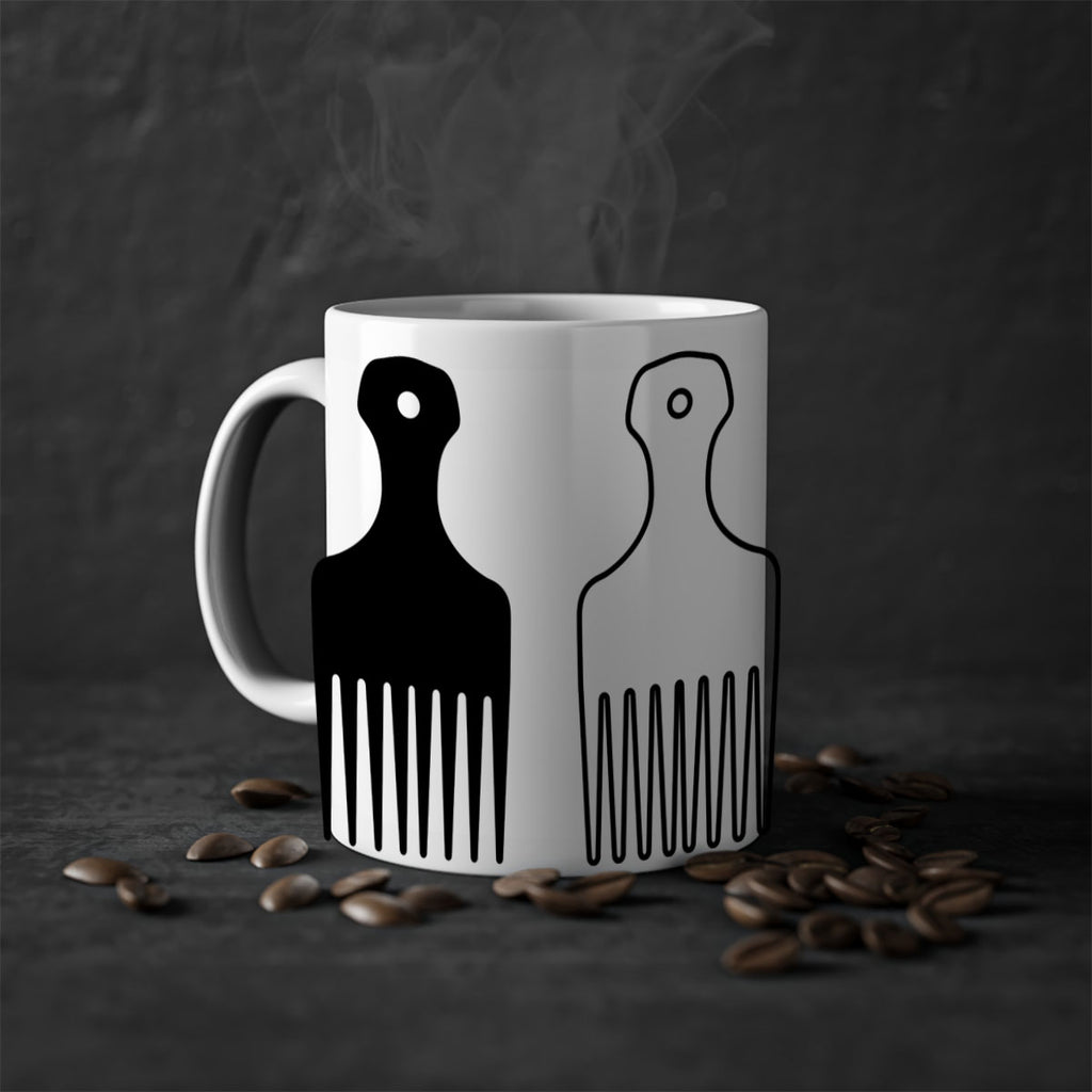 Enjoy the afrohairpick 273# Mug . Here to bring big gulps of coffee, Tea or any beverage and style, these two-tone coffee mugs help people around the world start the day just right. Choose between 5 different color options and 2 sizes to best complement the design. Each mug comes with a colored handle, a colored interior, and a classy, glossy finish so that your mugs become an instant favorite.