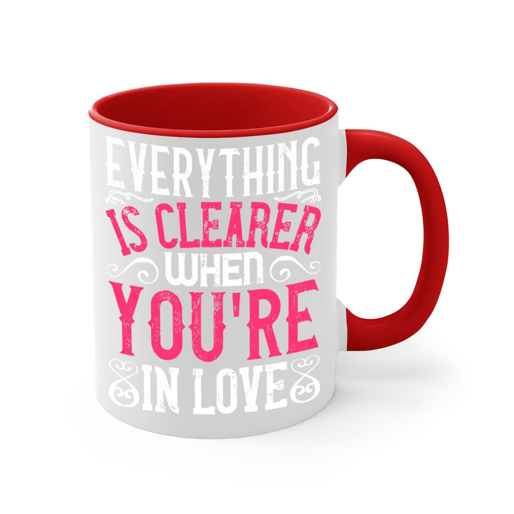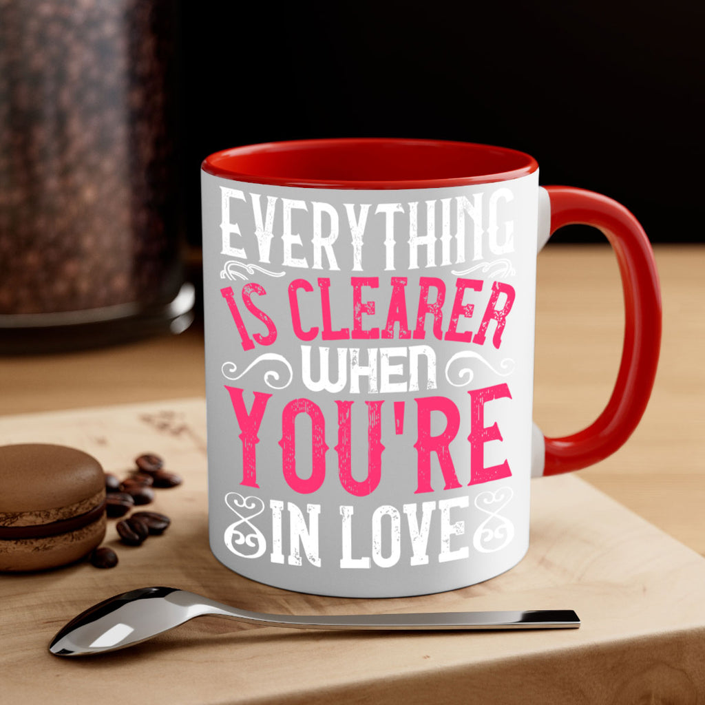 Enjoy the Everything is clearer when youre in love Style 48# Mug . Here to bring big gulps of coffee, Tea or any beverage and style, these two-tone coffee mugs help people around the world start the day just right. Choose between 5 different color options and 2 sizes to best complement the design. Each mug comes with a colored handle, a colored interior, and a classy, glossy finish so that your mugs become an instant favorite.