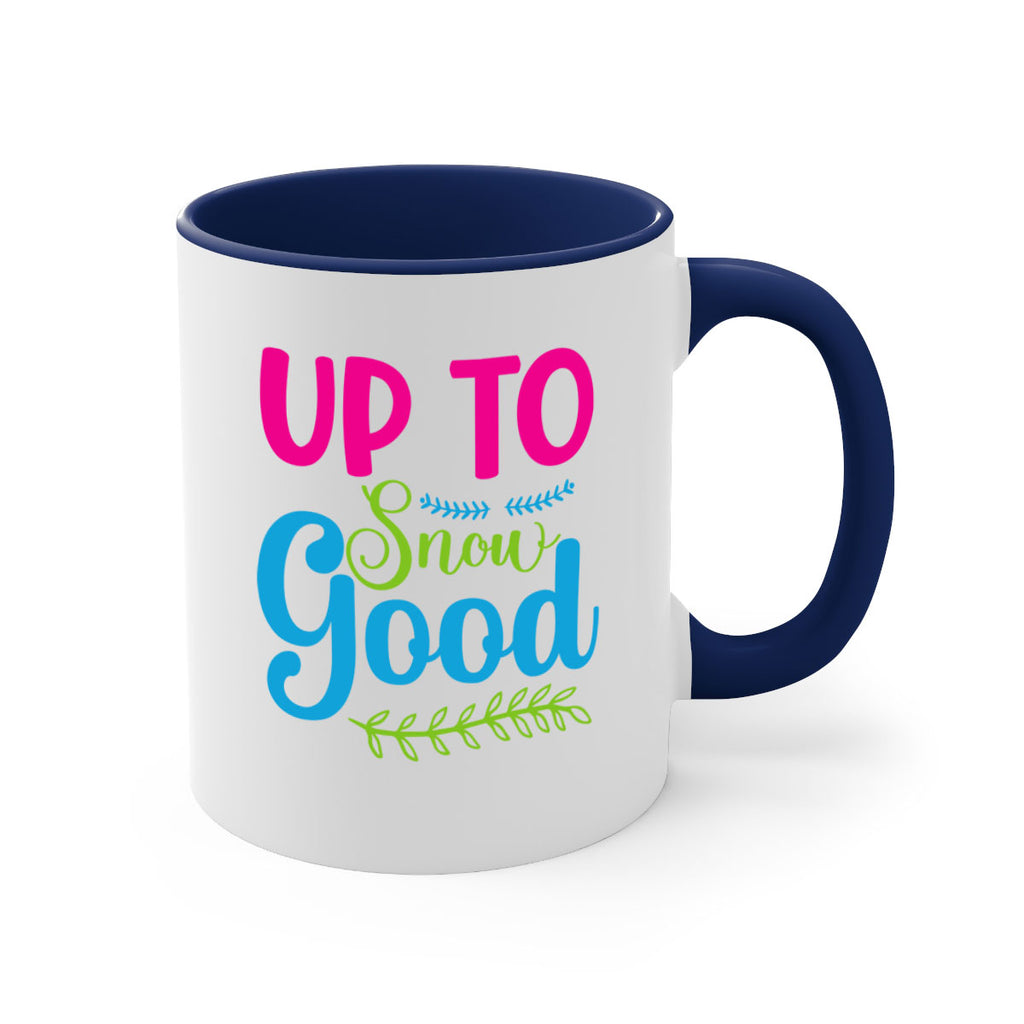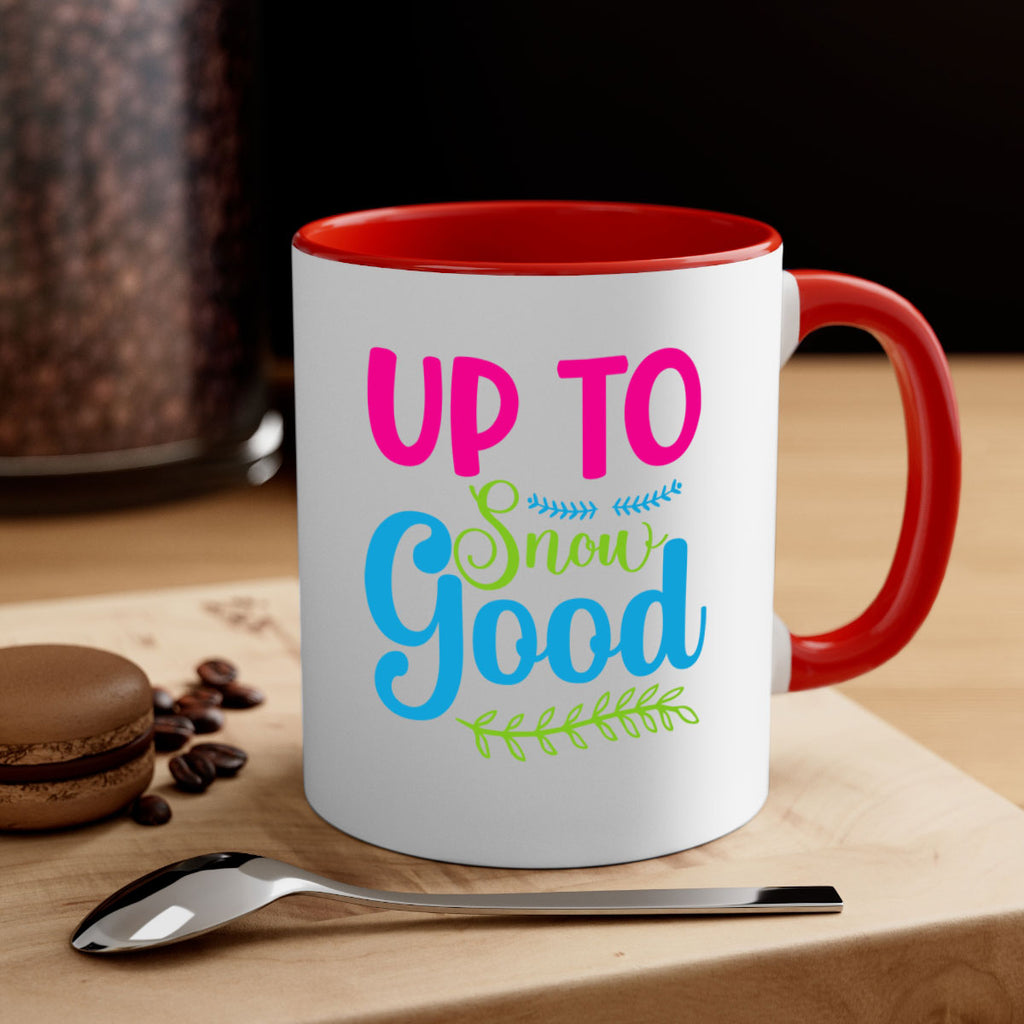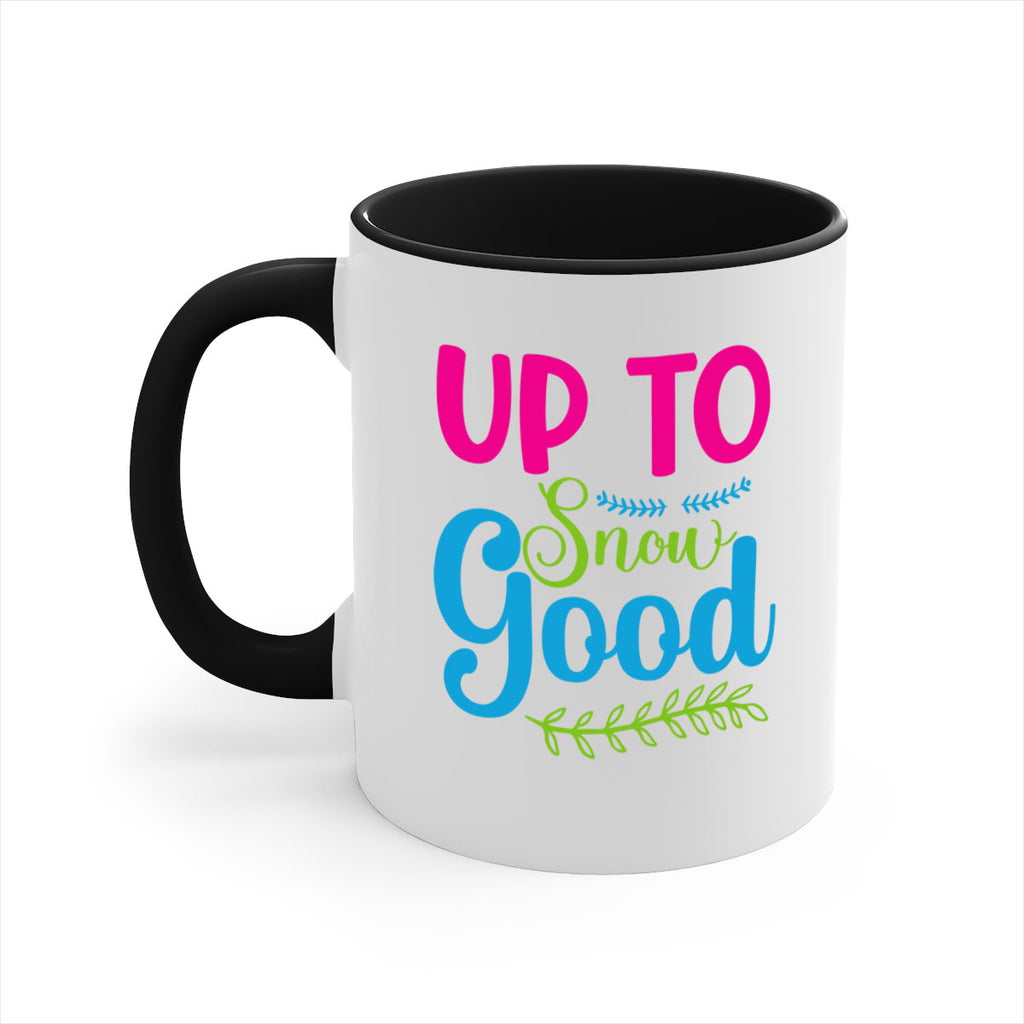 Enjoy the Up To Snow Good 425# Mug . Here to bring big gulps of coffee, Tea or any beverage and style, these two-tone coffee mugs help people around the world start the day just right. Choose between 5 different color options and 2 sizes to best complement the design. Each mug comes with a colored handle, a colored interior, and a classy, glossy finish so that your mugs become an instant favorite.
