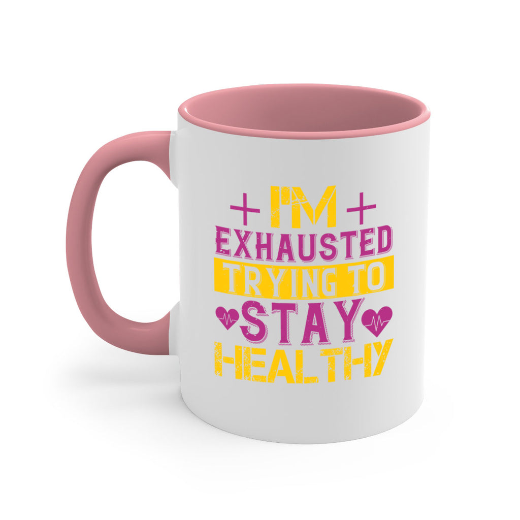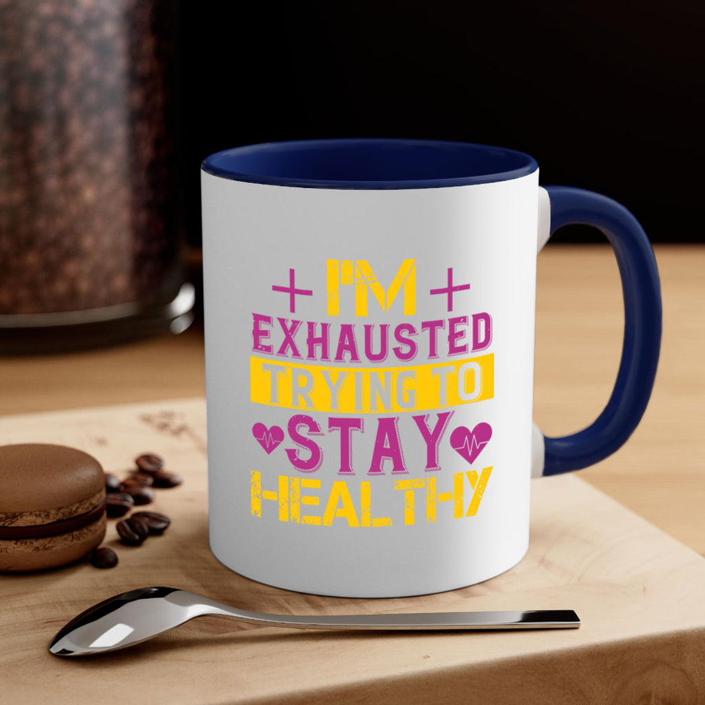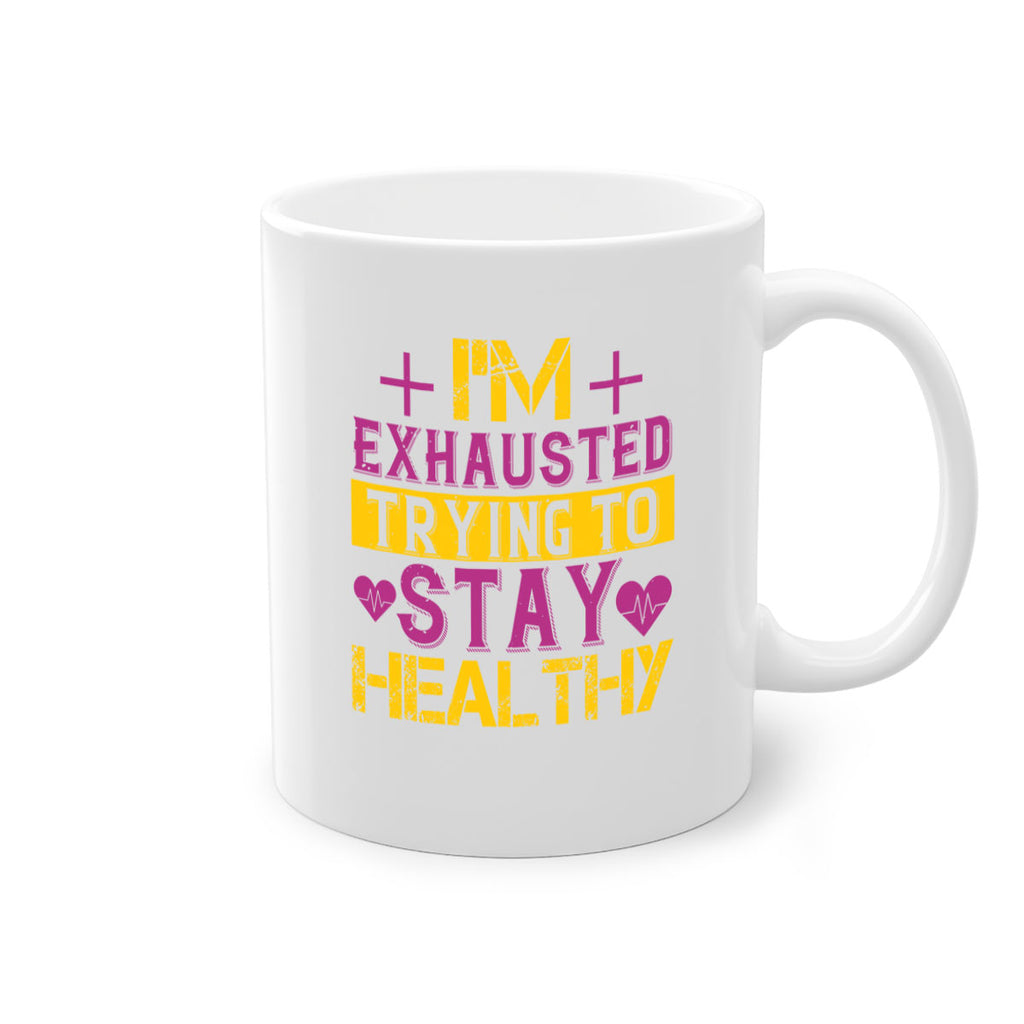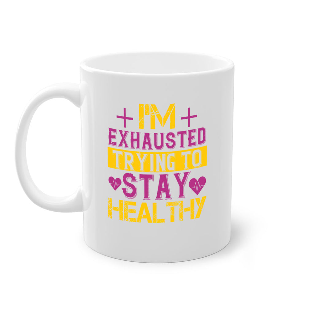 Enjoy the Im exhausted trying to stay healthy Style 30# Mug . Here to bring big gulps of coffee, Tea or any beverage and style, these two-tone coffee mugs help people around the world start the day just right. Choose between 5 different color options and 2 sizes to best complement the design. Each mug comes with a colored handle, a colored interior, and a classy, glossy finish so that your mugs become an instant favorite.