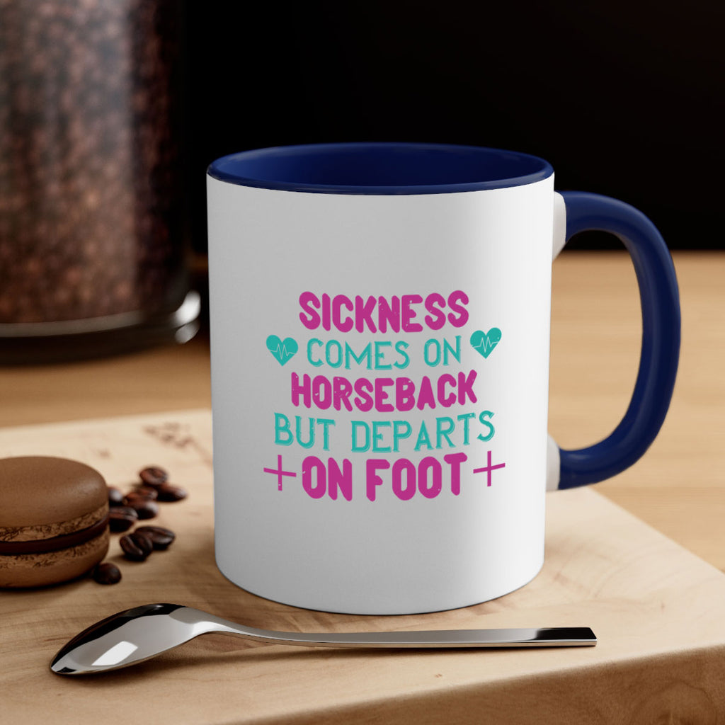 Enjoy the Sickness comes on horseback but departs on foot Style 15# Mug . Here to bring big gulps of coffee, Tea or any beverage and style, these two-tone coffee mugs help people around the world start the day just right. Choose between 5 different color options and 2 sizes to best complement the design. Each mug comes with a colored handle, a colored interior, and a classy, glossy finish so that your mugs become an instant favorite.