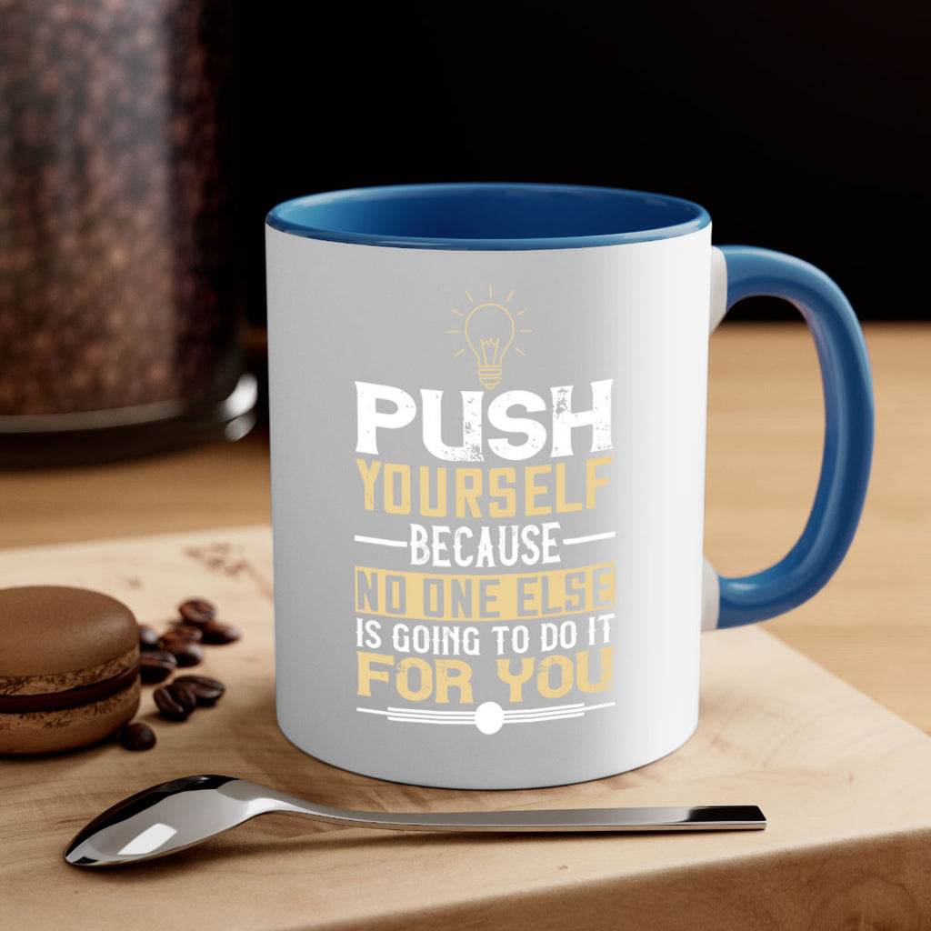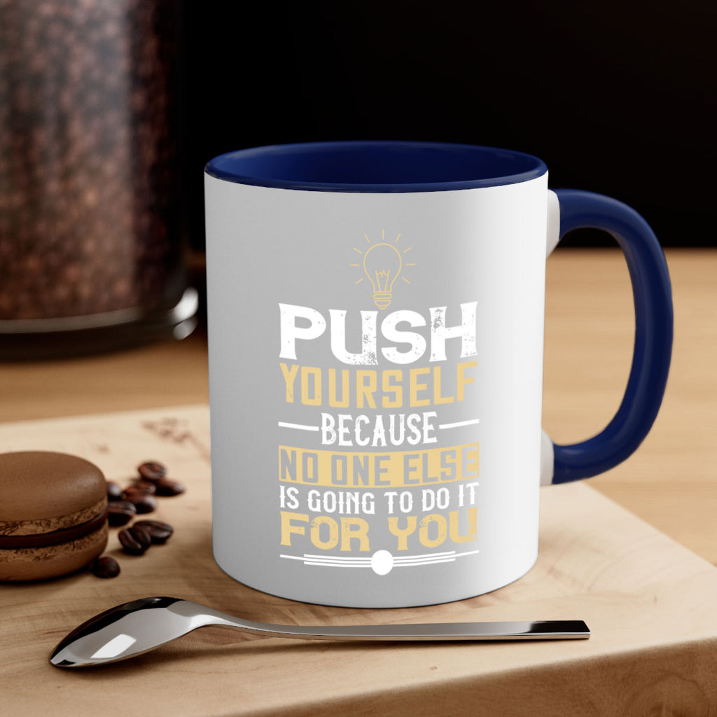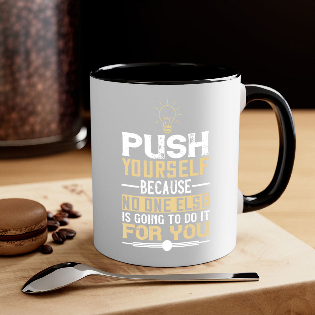 Enjoy the Push yourself because no one else is going to do it for you Style 26# Mug . Here to bring big gulps of coffee, Tea or any beverage and style, these two-tone coffee mugs help people around the world start the day just right. Choose between 5 different color options and 2 sizes to best complement the design. Each mug comes with a colored handle, a colored interior, and a classy, glossy finish so that your mugs become an instant favorite.