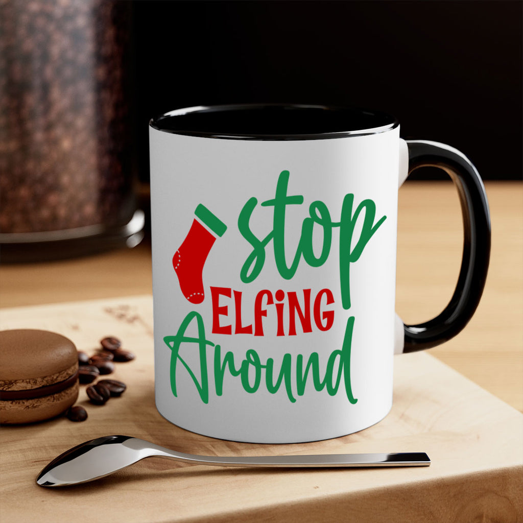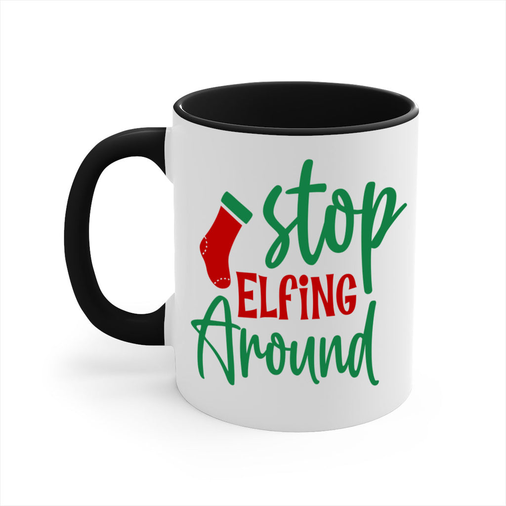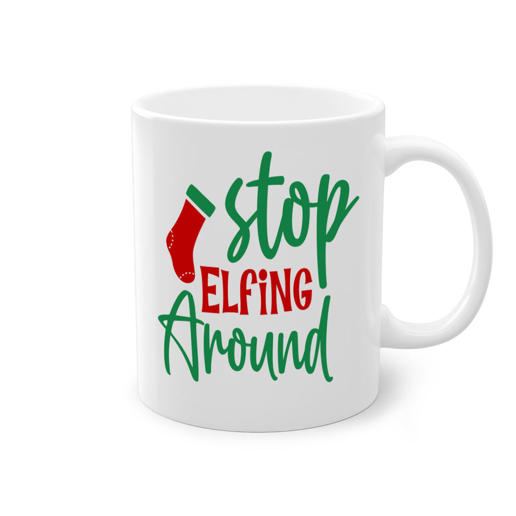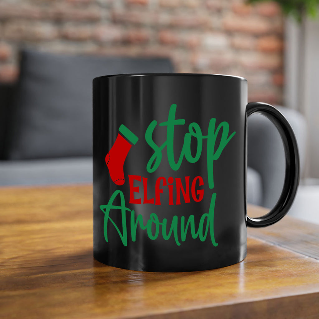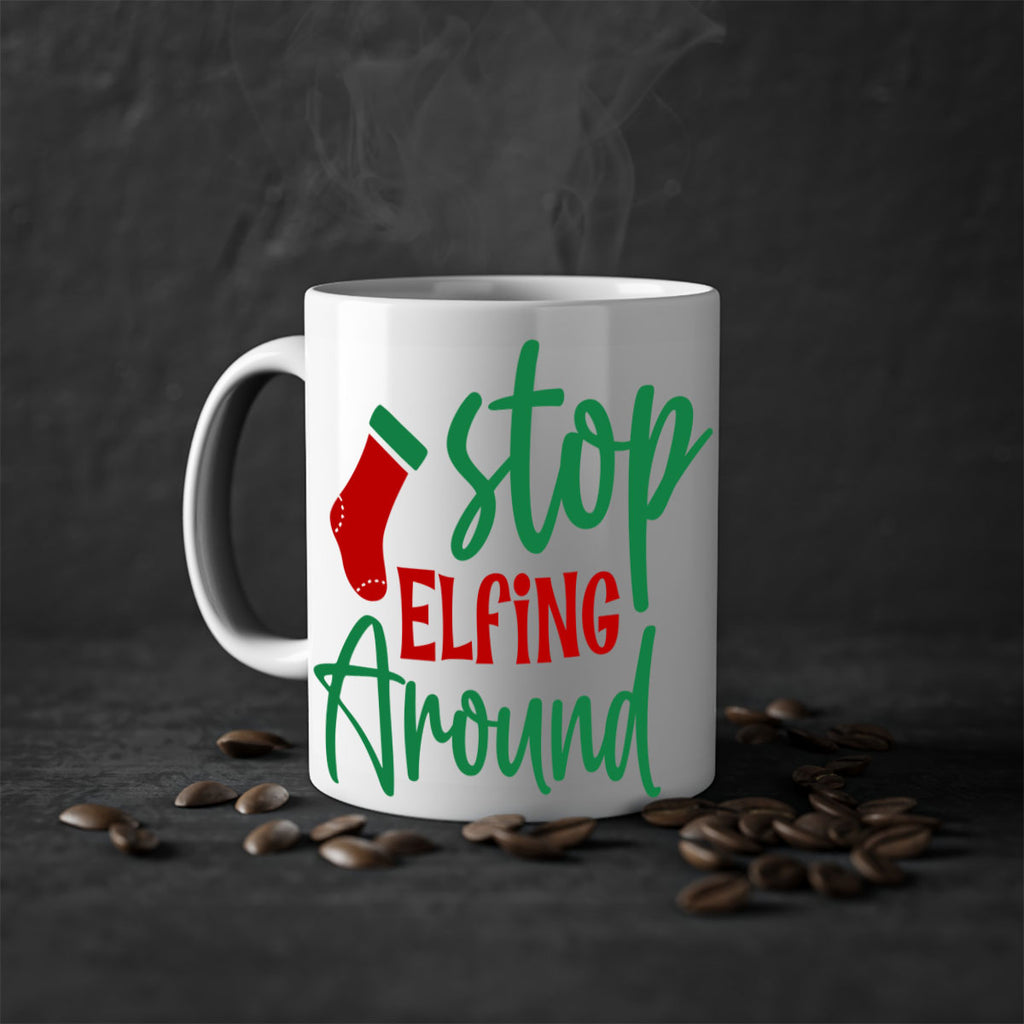 Enjoy the stop elfing around style 1183# Mug . Here to bring big gulps of coffee, Tea or any beverage and style, these two-tone coffee mugs help people around the world start the day just right. Choose between 5 different color options and 2 sizes to best complement the design. Each mug comes with a colored handle, a colored interior, and a classy, glossy finish so that your mugs become an instant favorite.