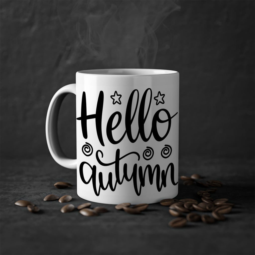 Enjoy the Hello Autumn 270# Mug . Here to bring big gulps of coffee, Tea or any beverage and style, these two-tone coffee mugs help people around the world start the day just right. Choose between 5 different color options and 2 sizes to best complement the design. Each mug comes with a colored handle, a colored interior, and a classy, glossy finish so that your mugs become an instant favorite.