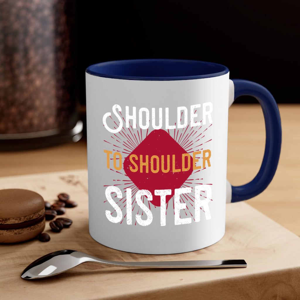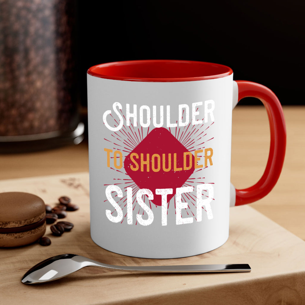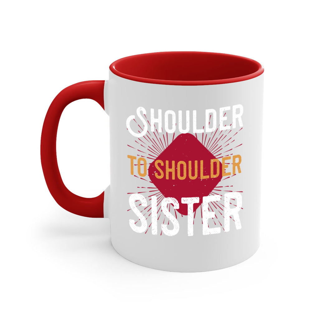 Enjoy the shoulder to shoulder sister 19# Mug . Here to bring big gulps of coffee, Tea or any beverage and style, these two-tone coffee mugs help people around the world start the day just right. Choose between 5 different color options and 2 sizes to best complement the design. Each mug comes with a colored handle, a colored interior, and a classy, glossy finish so that your mugs become an instant favorite.