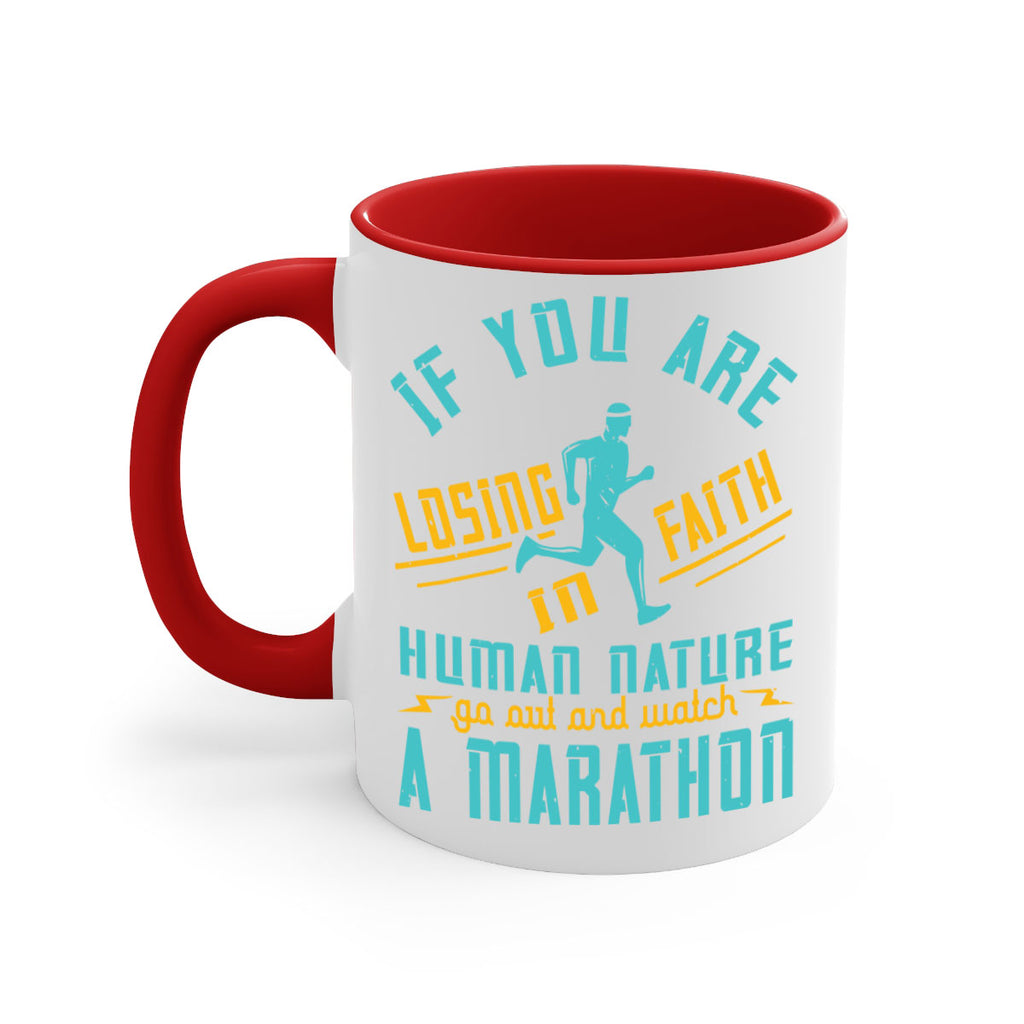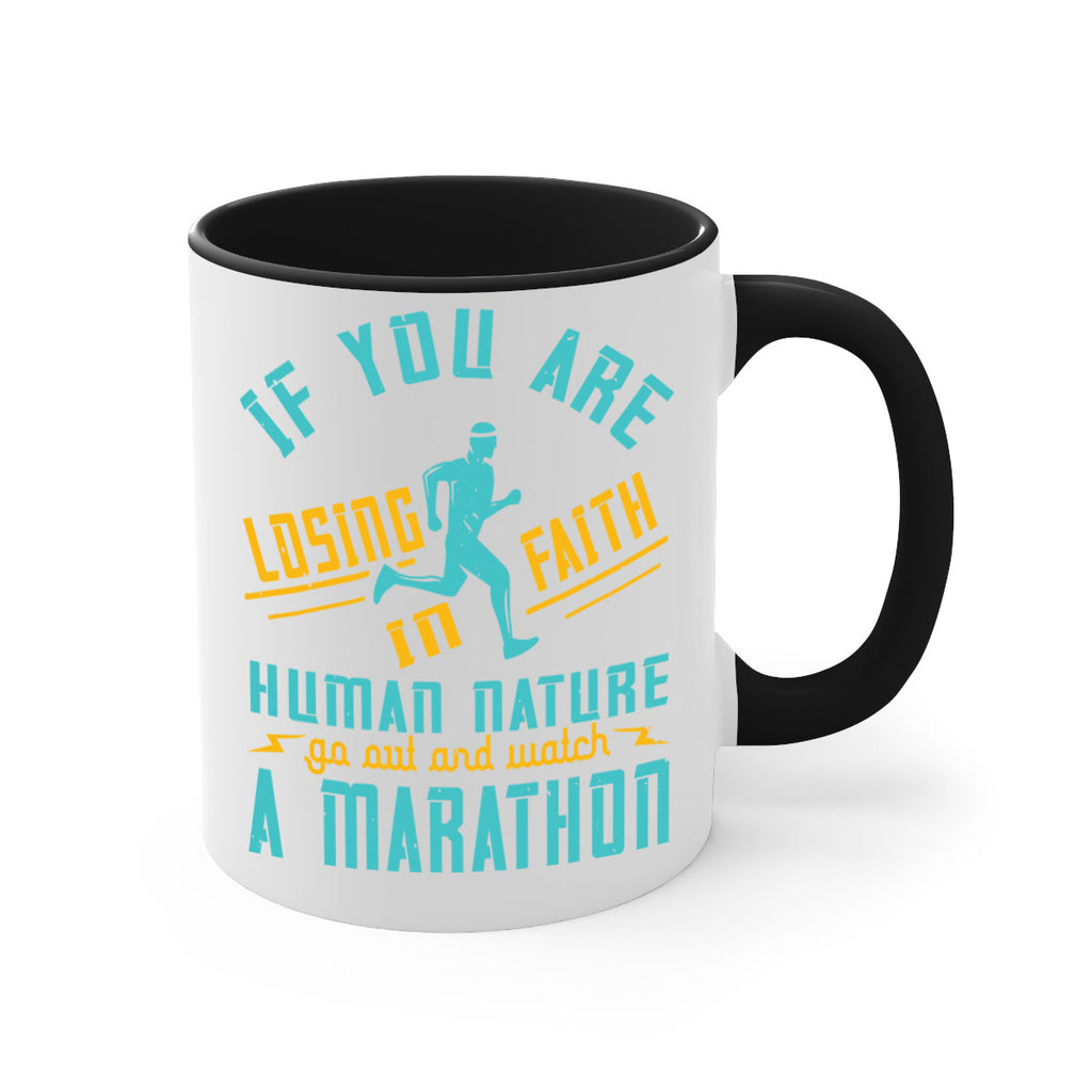 Enjoy the if you are losing faith in human nature go out and watch a marathon 37# Mug . Here to bring big gulps of coffee, Tea or any beverage and style, these two-tone coffee mugs help people around the world start the day just right. Choose between 5 different color options and 2 sizes to best complement the design. Each mug comes with a colored handle, a colored interior, and a classy, glossy finish so that your mugs become an instant favorite.
