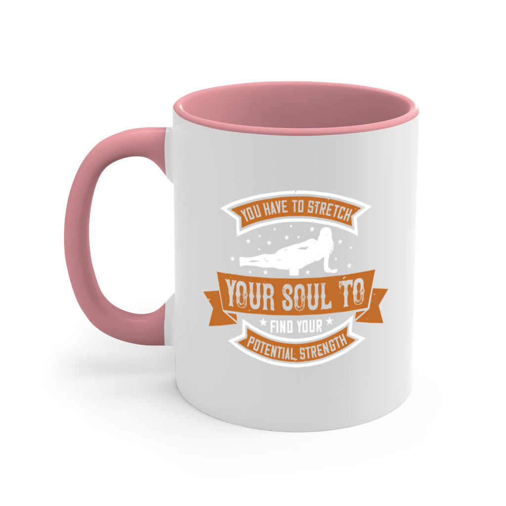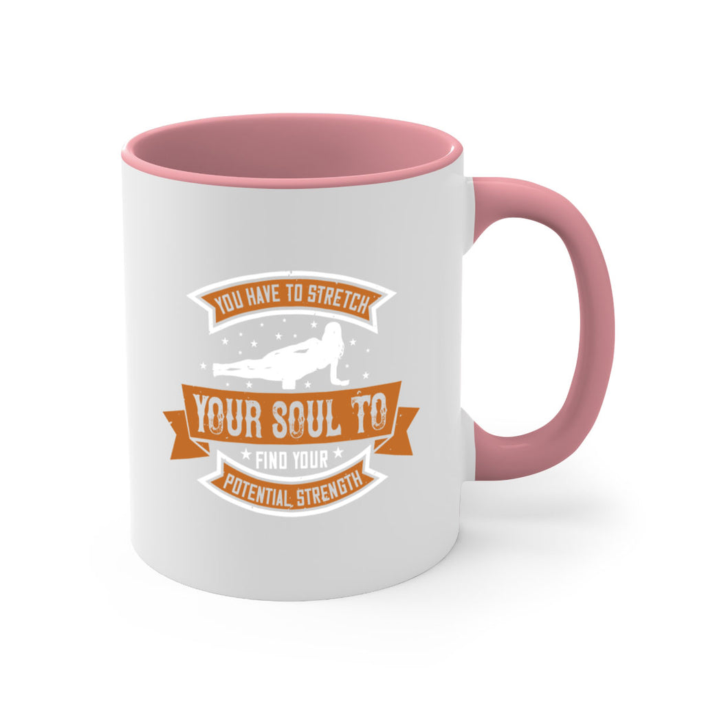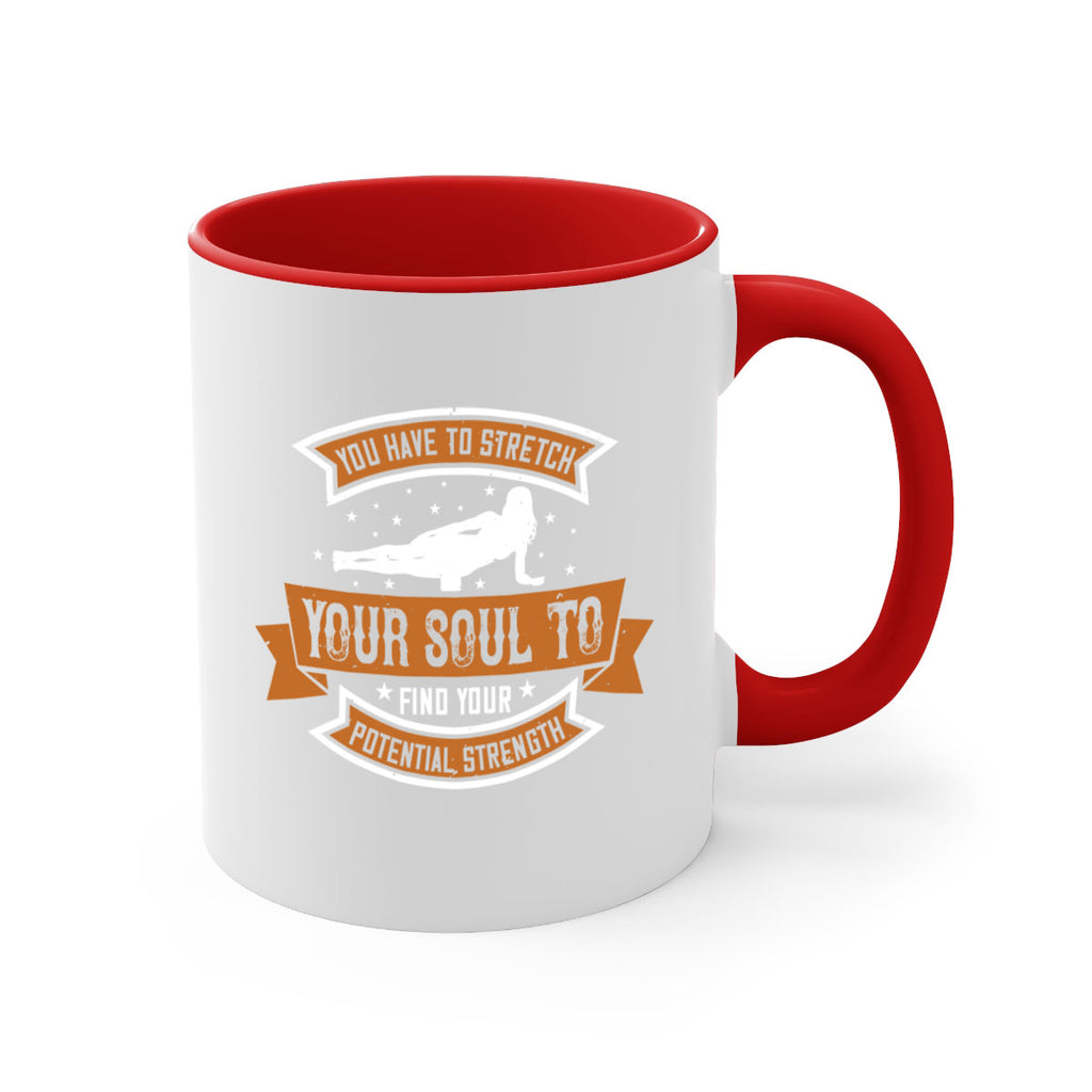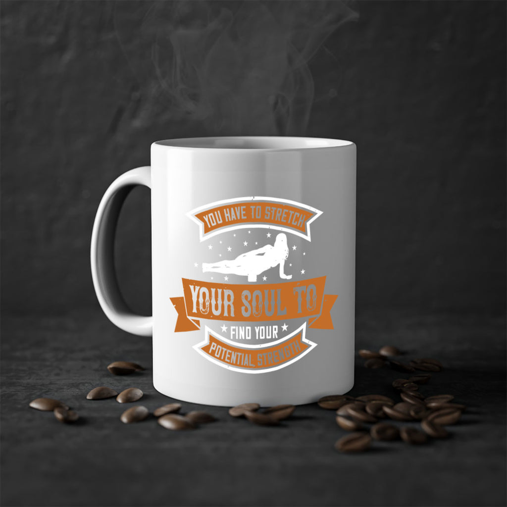 Enjoy the you have to stretch your soul to find your potential strength 2# Mug . Here to bring big gulps of coffee, Tea or any beverage and style, these two-tone coffee mugs help people around the world start the day just right. Choose between 5 different color options and 2 sizes to best complement the design. Each mug comes with a colored handle, a colored interior, and a classy, glossy finish so that your mugs become an instant favorite.