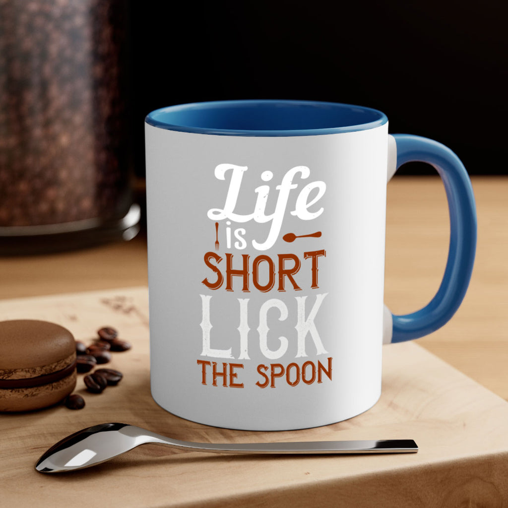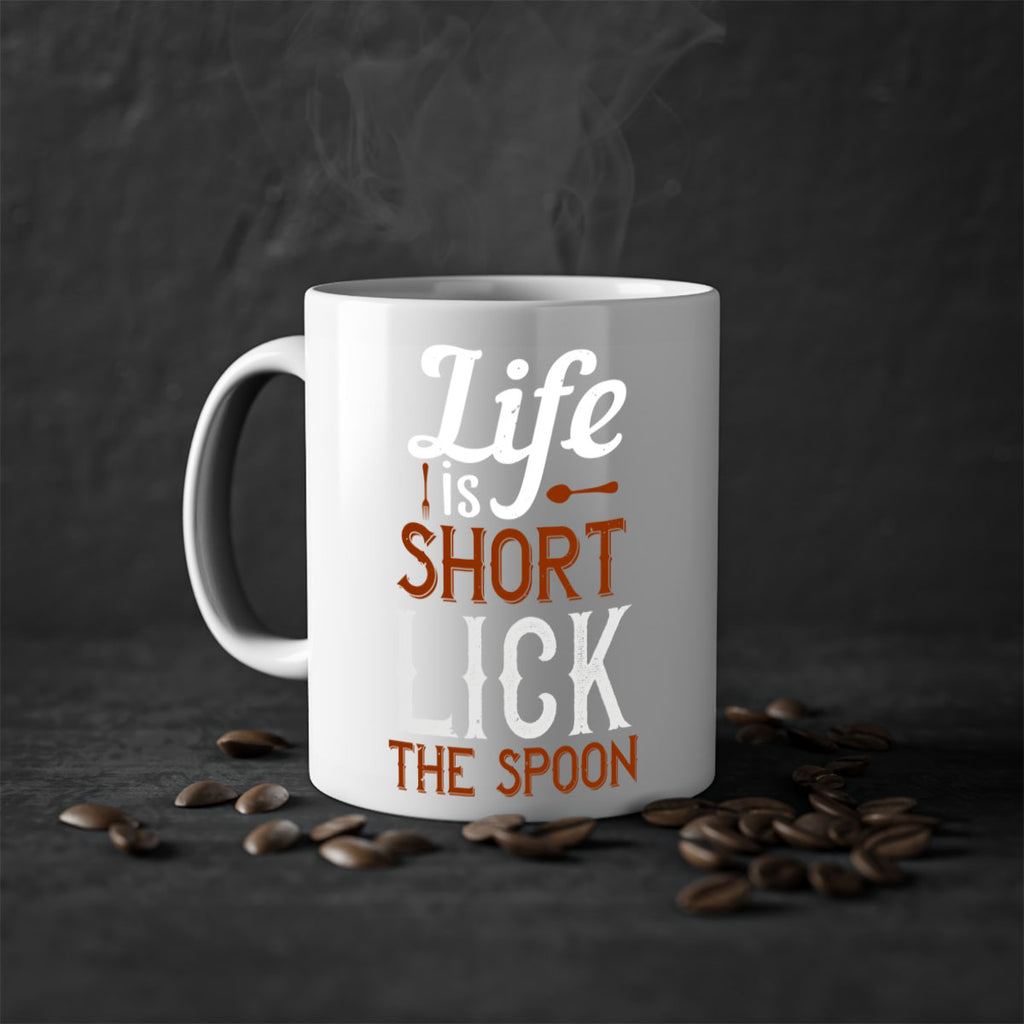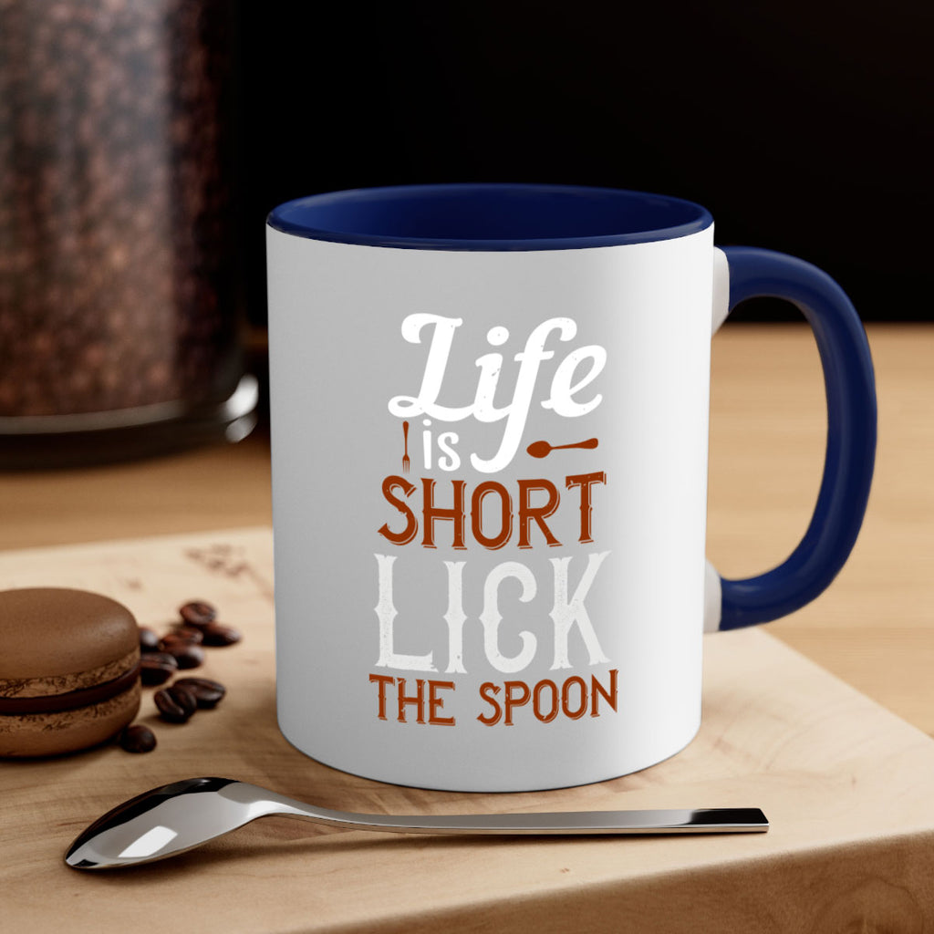 Enjoy the life is short lick the spoon 19# Mug . Here to bring big gulps of coffee, Tea or any beverage and style, these two-tone coffee mugs help people around the world start the day just right. Choose between 5 different color options and 2 sizes to best complement the design. Each mug comes with a colored handle, a colored interior, and a classy, glossy finish so that your mugs become an instant favorite.