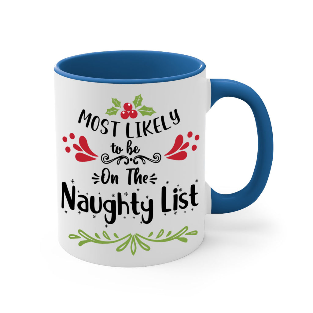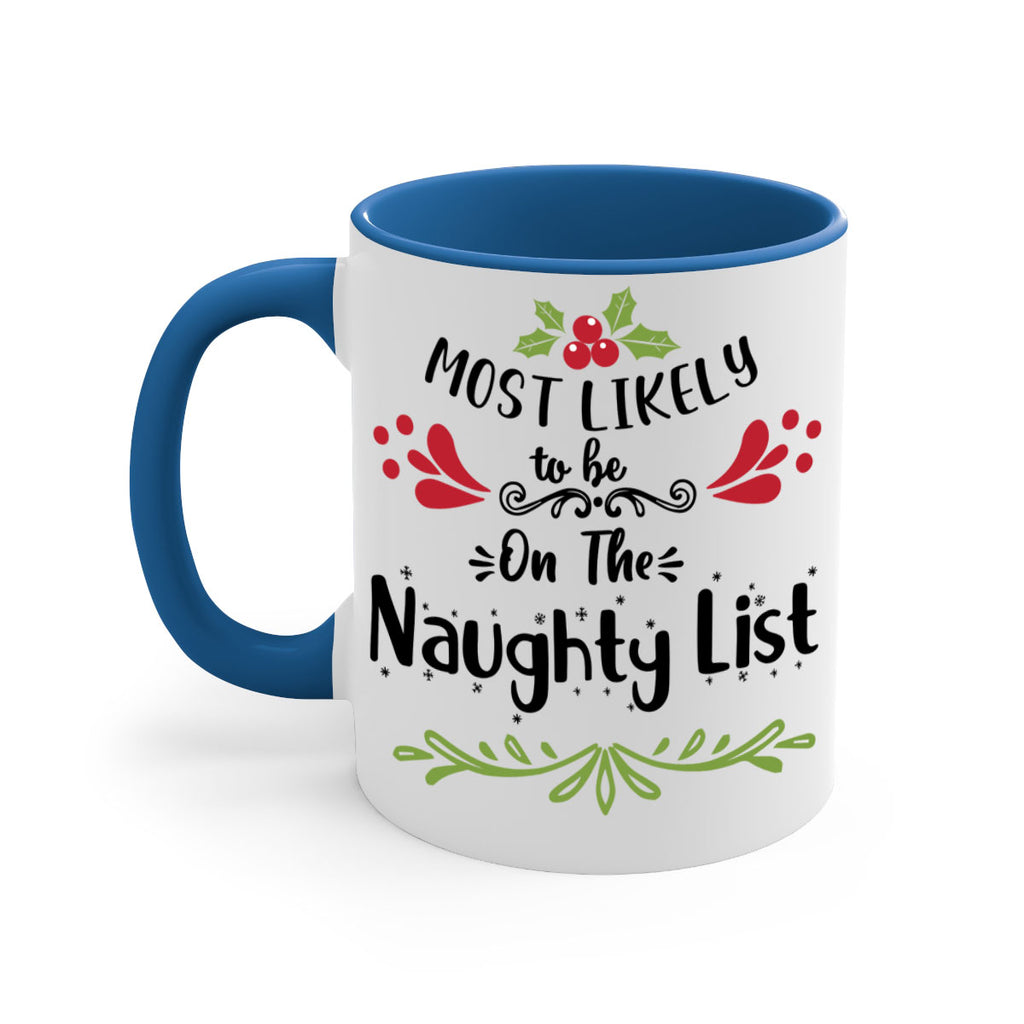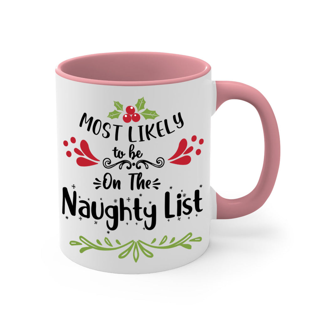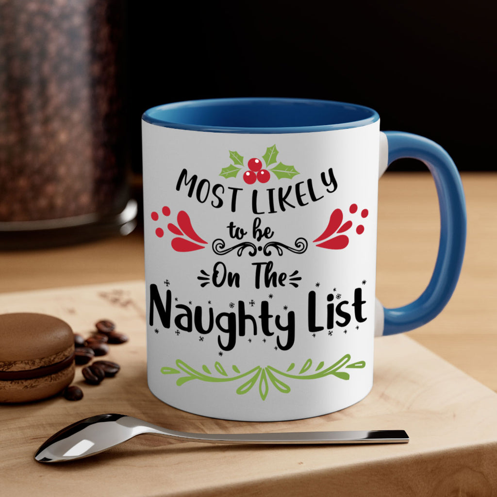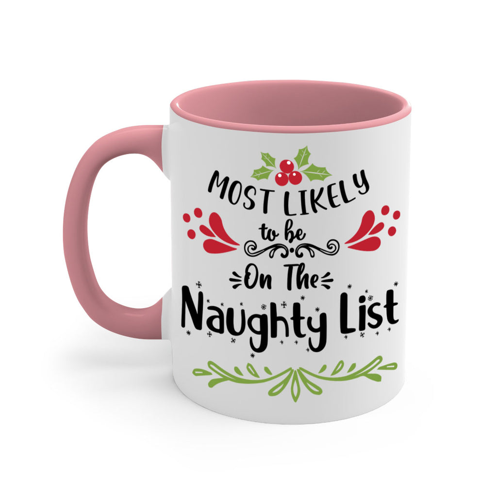 Enjoy the most likely to be on the naughty list style 518# Mug . Here to bring big gulps of coffee, Tea or any beverage and style, these two-tone coffee mugs help people around the world start the day just right. Choose between 5 different color options and 2 sizes to best complement the design. Each mug comes with a colored handle, a colored interior, and a classy, glossy finish so that your mugs become an instant favorite.