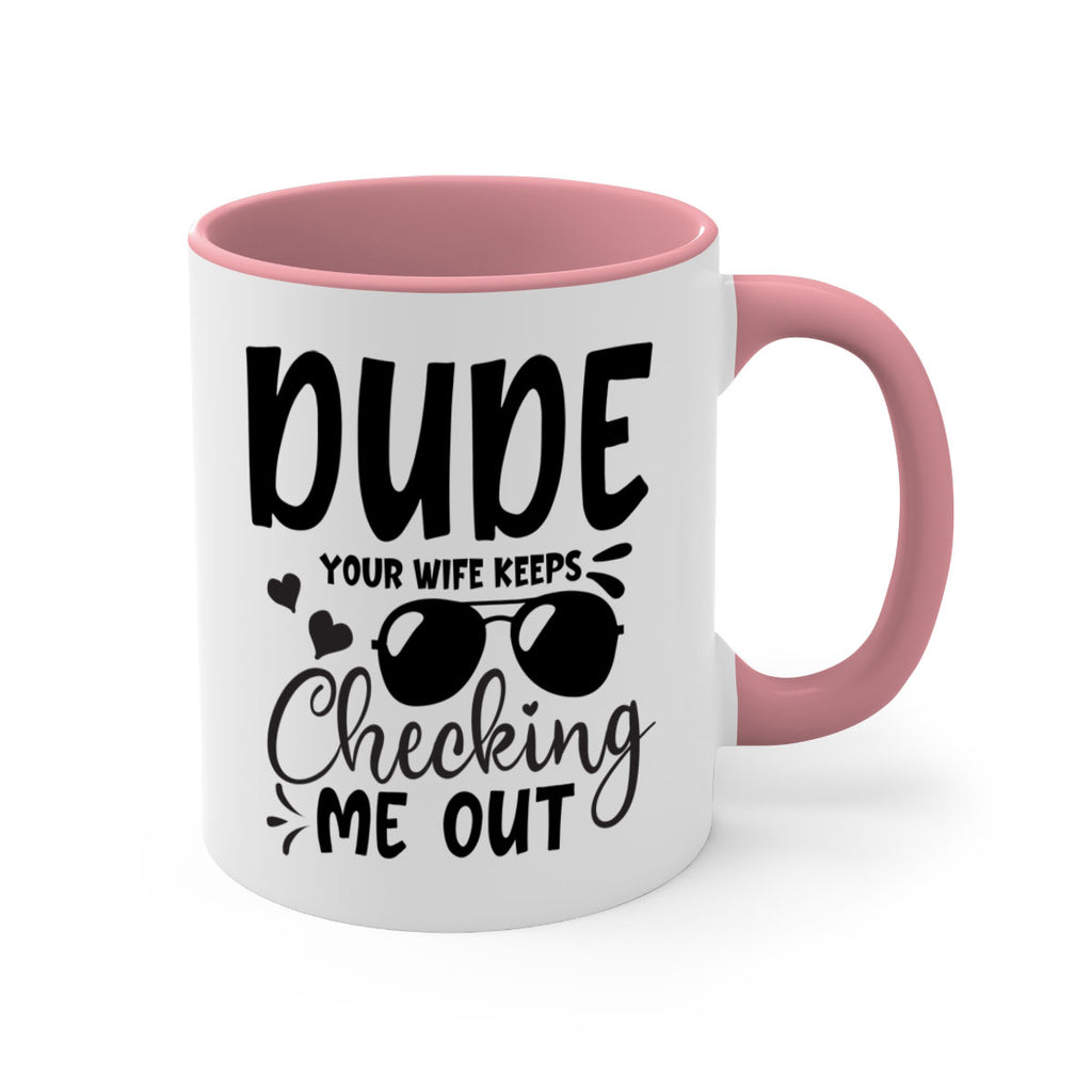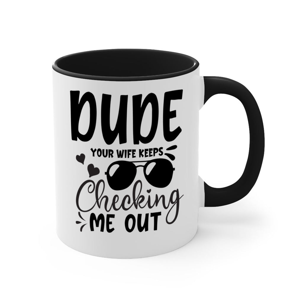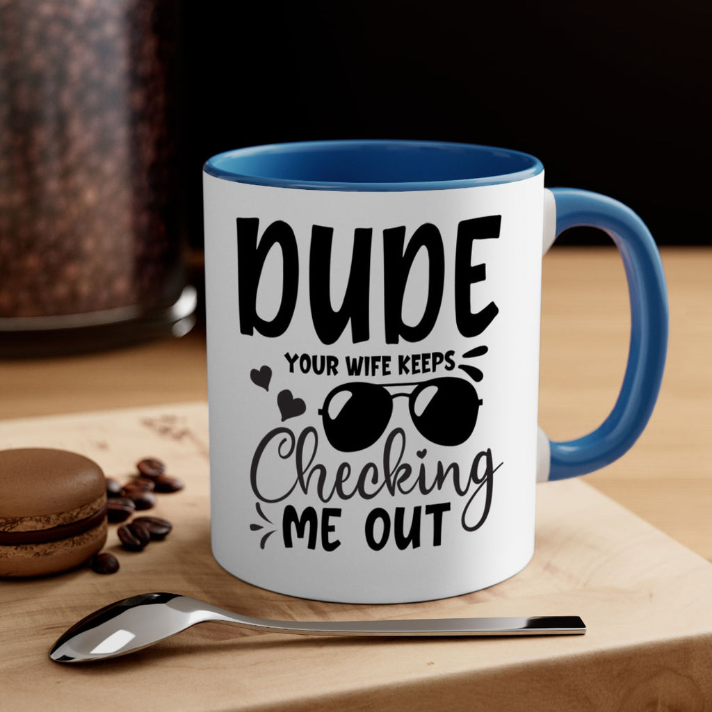 Enjoy the dude your wife keeps cheeking me out Style 266# Mug . Here to bring big gulps of coffee, Tea or any beverage and style, these two-tone coffee mugs help people around the world start the day just right. Choose between 5 different color options and 2 sizes to best complement the design. Each mug comes with a colored handle, a colored interior, and a classy, glossy finish so that your mugs become an instant favorite.