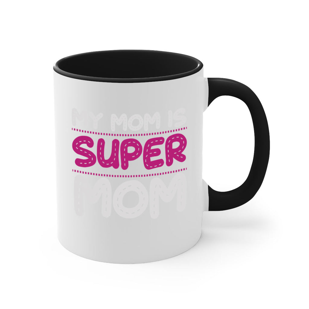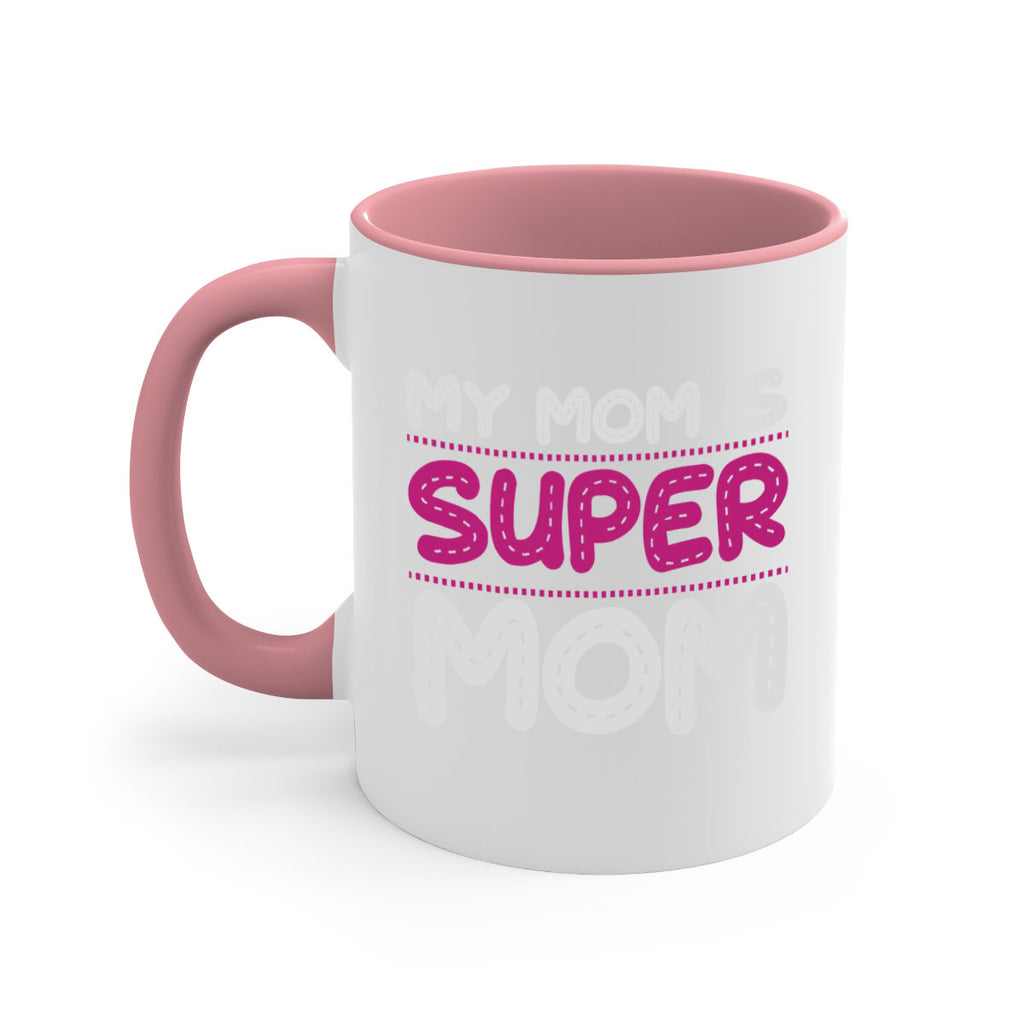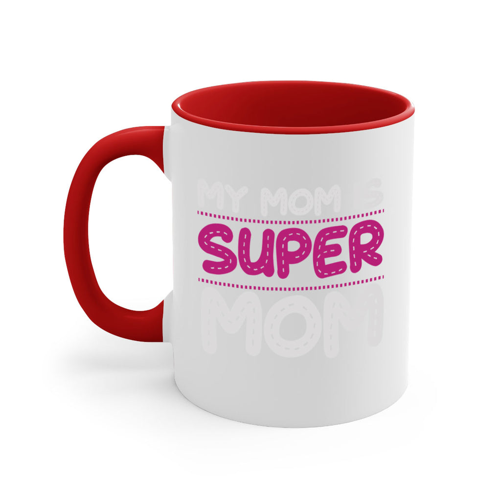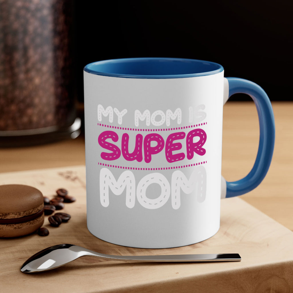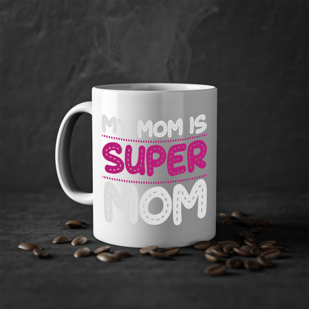 Enjoy the my mom is super mom 90# Mug . Here to bring big gulps of coffee, Tea or any beverage and style, these two-tone coffee mugs help people around the world start the day just right. Choose between 5 different color options and 2 sizes to best complement the design. Each mug comes with a colored handle, a colored interior, and a classy, glossy finish so that your mugs become an instant favorite.