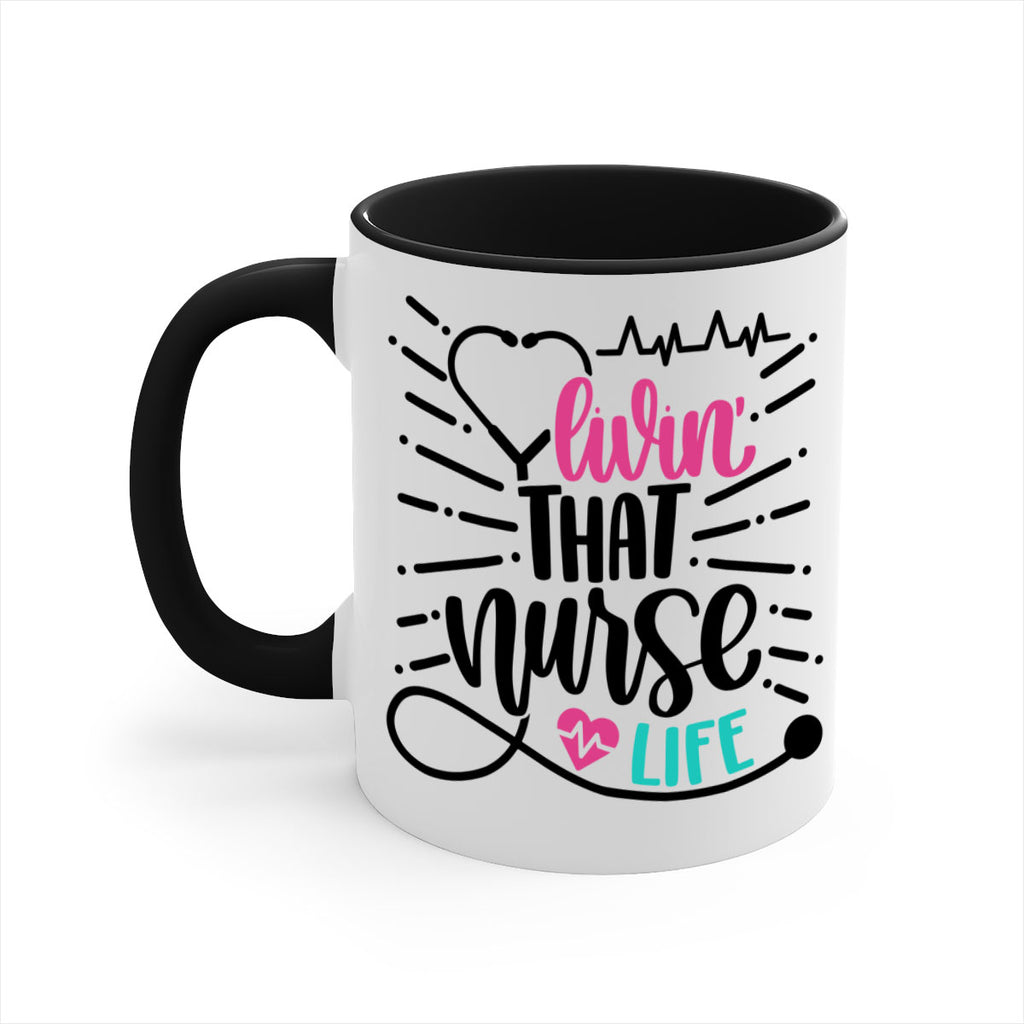 Enjoy the Livin That Nurse Life Style Style 140# Mug . Here to bring big gulps of coffee, Tea or any beverage and style, these two-tone coffee mugs help people around the world start the day just right. Choose between 5 different color options and 2 sizes to best complement the design. Each mug comes with a colored handle, a colored interior, and a classy, glossy finish so that your mugs become an instant favorite.