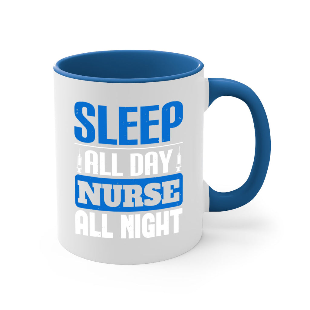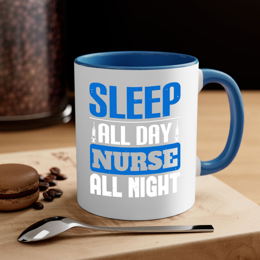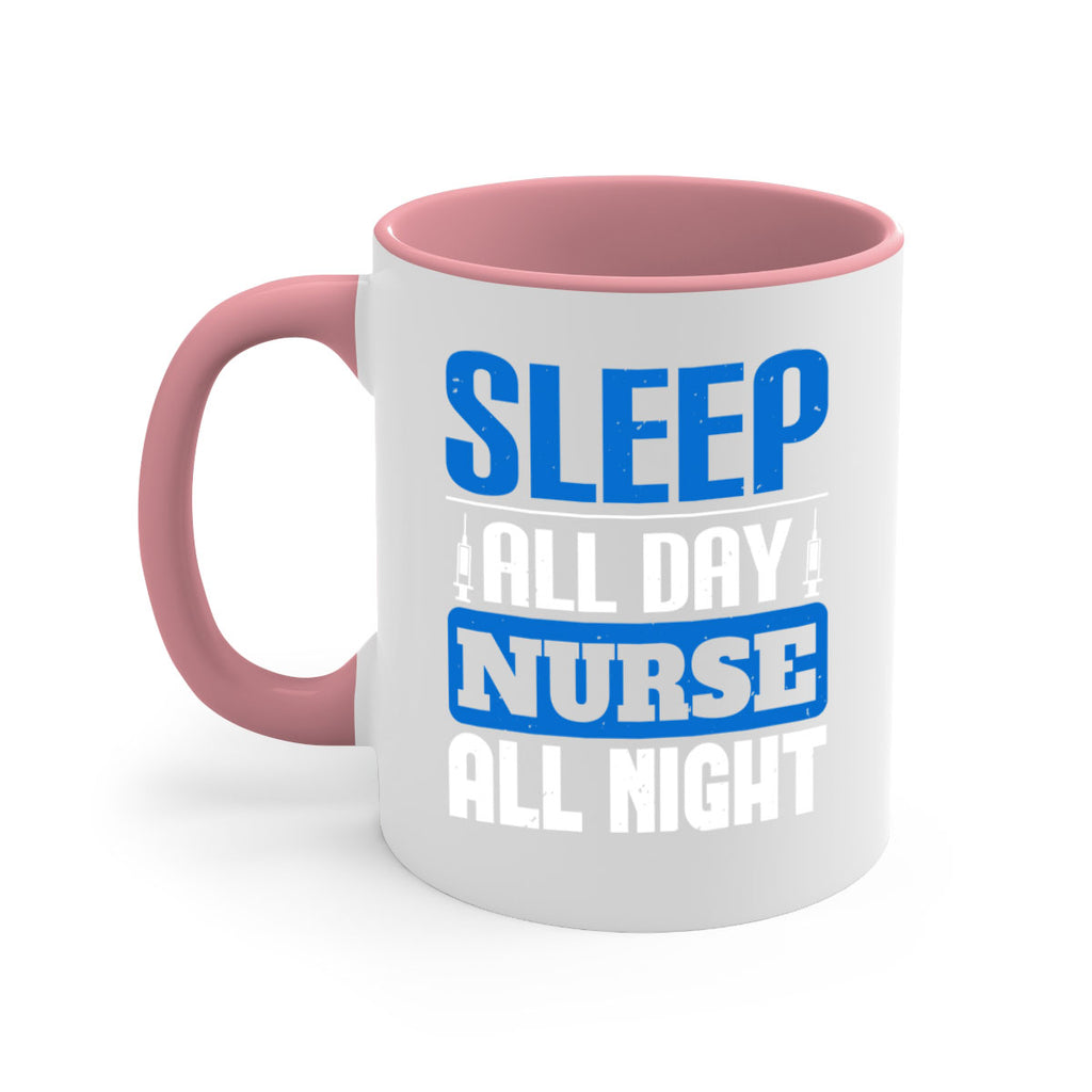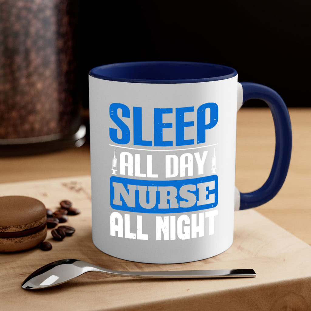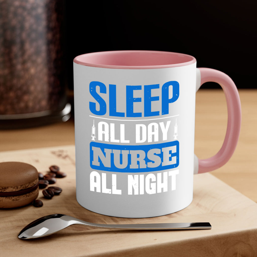 Enjoy the Sleep all day nurse all night Style 249# Mug . Here to bring big gulps of coffee, Tea or any beverage and style, these two-tone coffee mugs help people around the world start the day just right. Choose between 5 different color options and 2 sizes to best complement the design. Each mug comes with a colored handle, a colored interior, and a classy, glossy finish so that your mugs become an instant favorite.