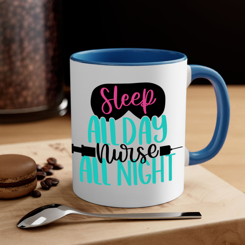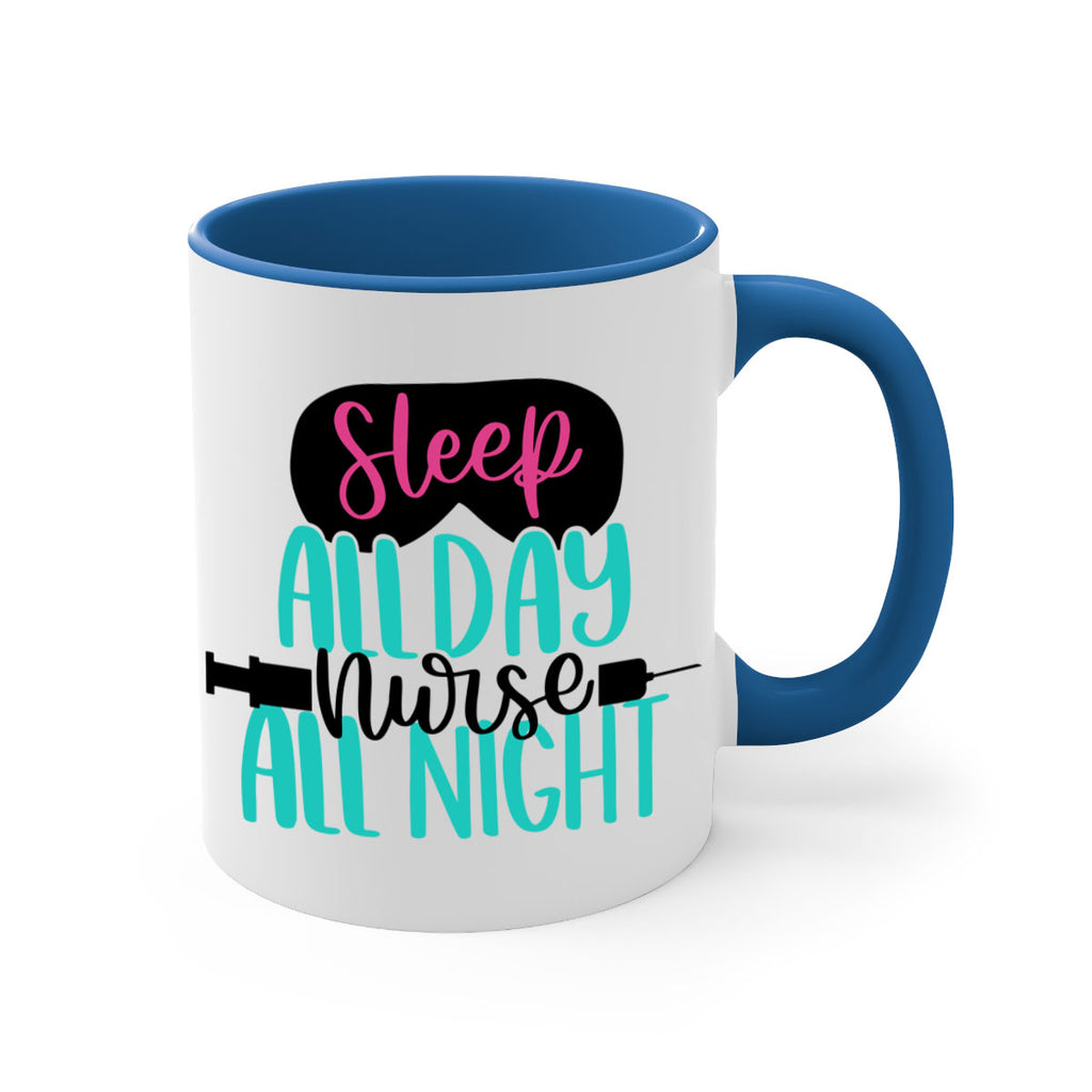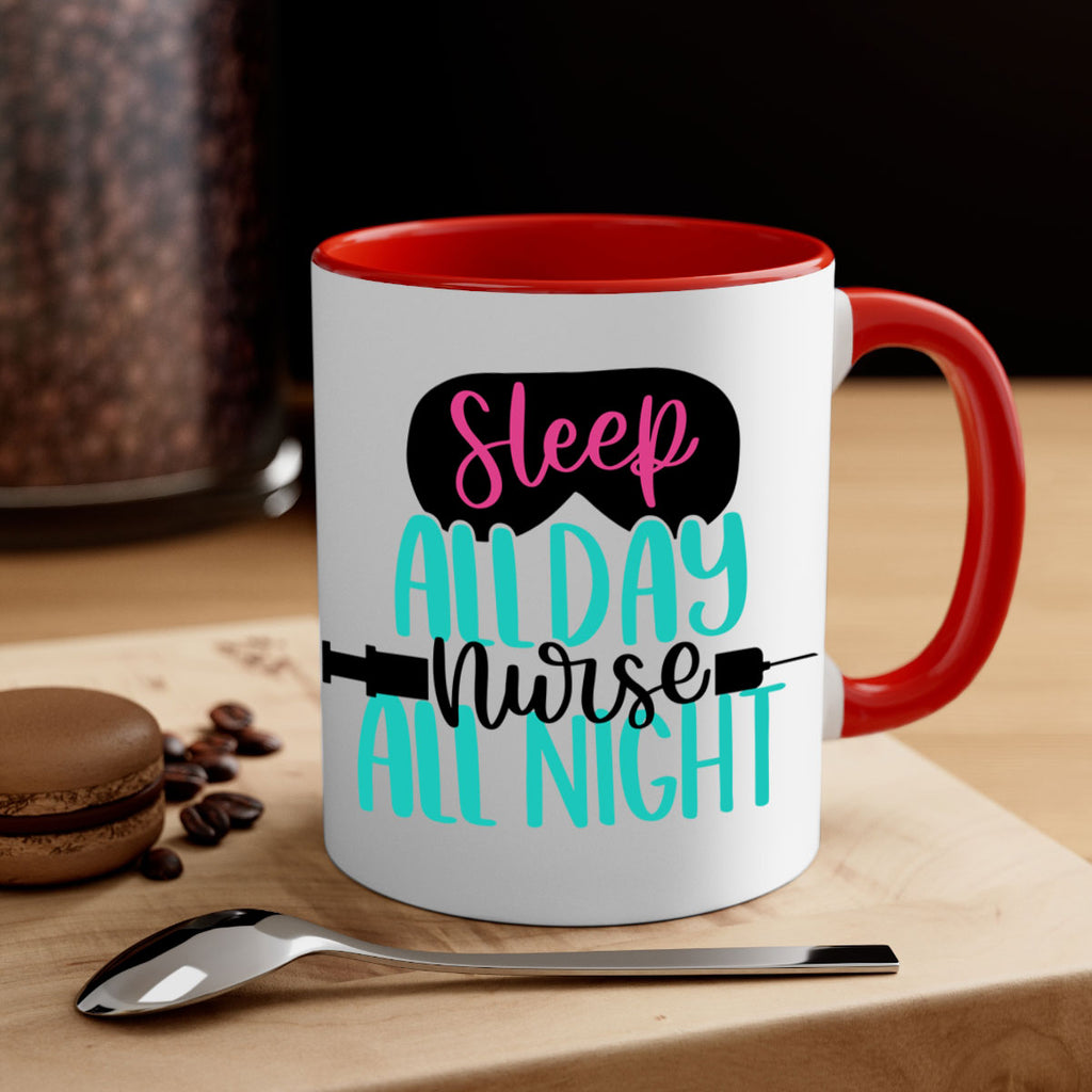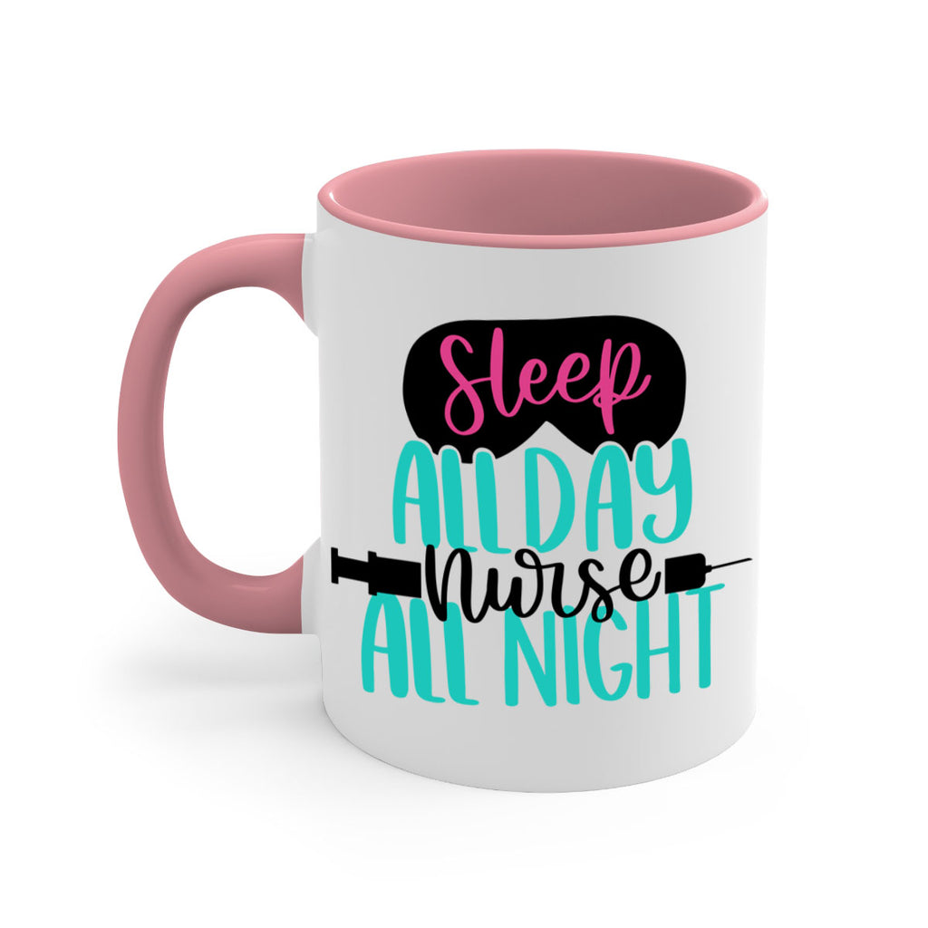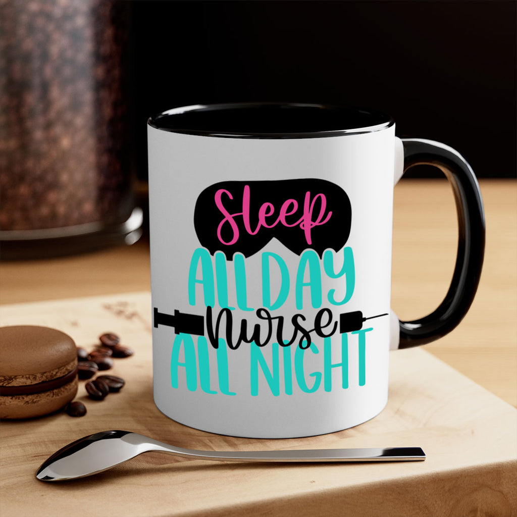 Enjoy the Sleep All Day Nurse All Style Style 32# Mug . Here to bring big gulps of coffee, Tea or any beverage and style, these two-tone coffee mugs help people around the world start the day just right. Choose between 5 different color options and 2 sizes to best complement the design. Each mug comes with a colored handle, a colored interior, and a classy, glossy finish so that your mugs become an instant favorite.