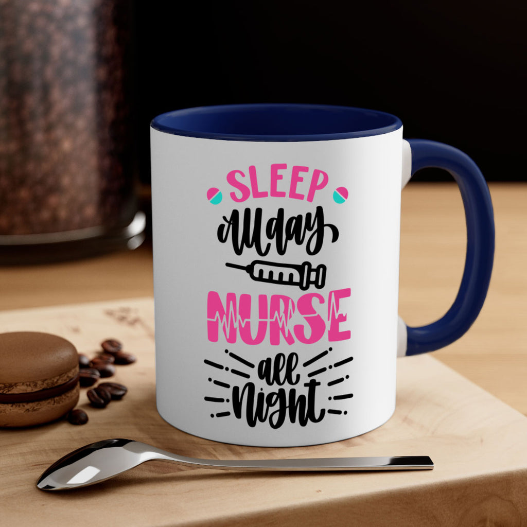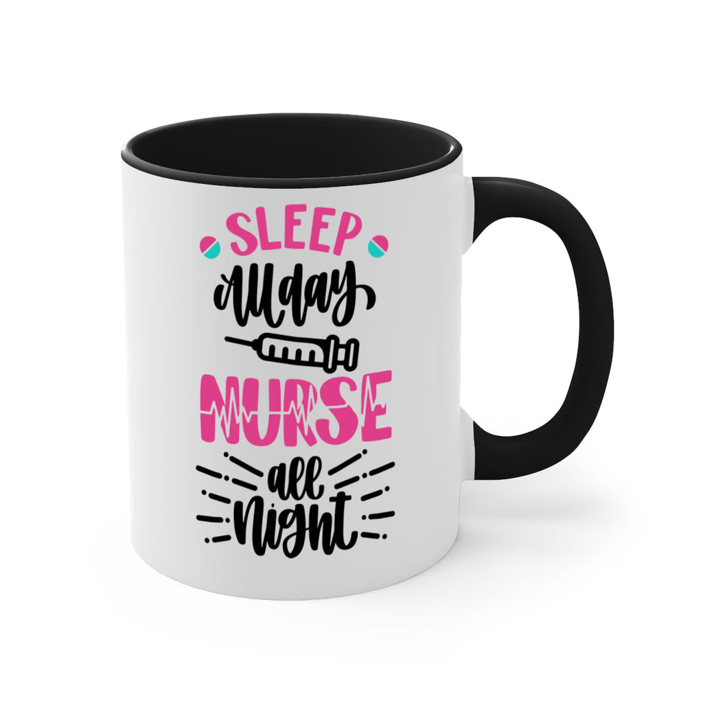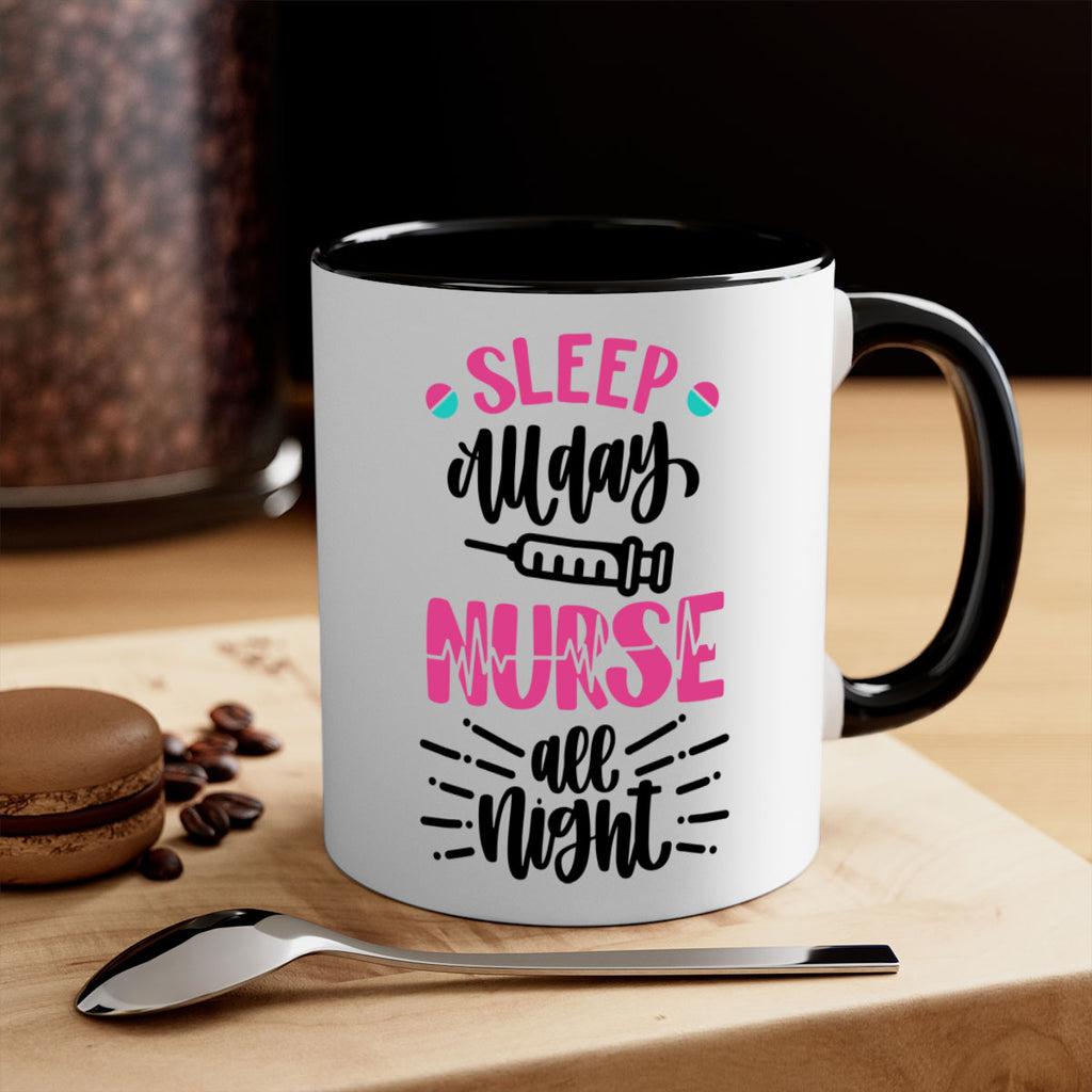 Enjoy the Sleep All Day Nurse All Style Style 33# Mug . Here to bring big gulps of coffee, Tea or any beverage and style, these two-tone coffee mugs help people around the world start the day just right. Choose between 5 different color options and 2 sizes to best complement the design. Each mug comes with a colored handle, a colored interior, and a classy, glossy finish so that your mugs become an instant favorite.