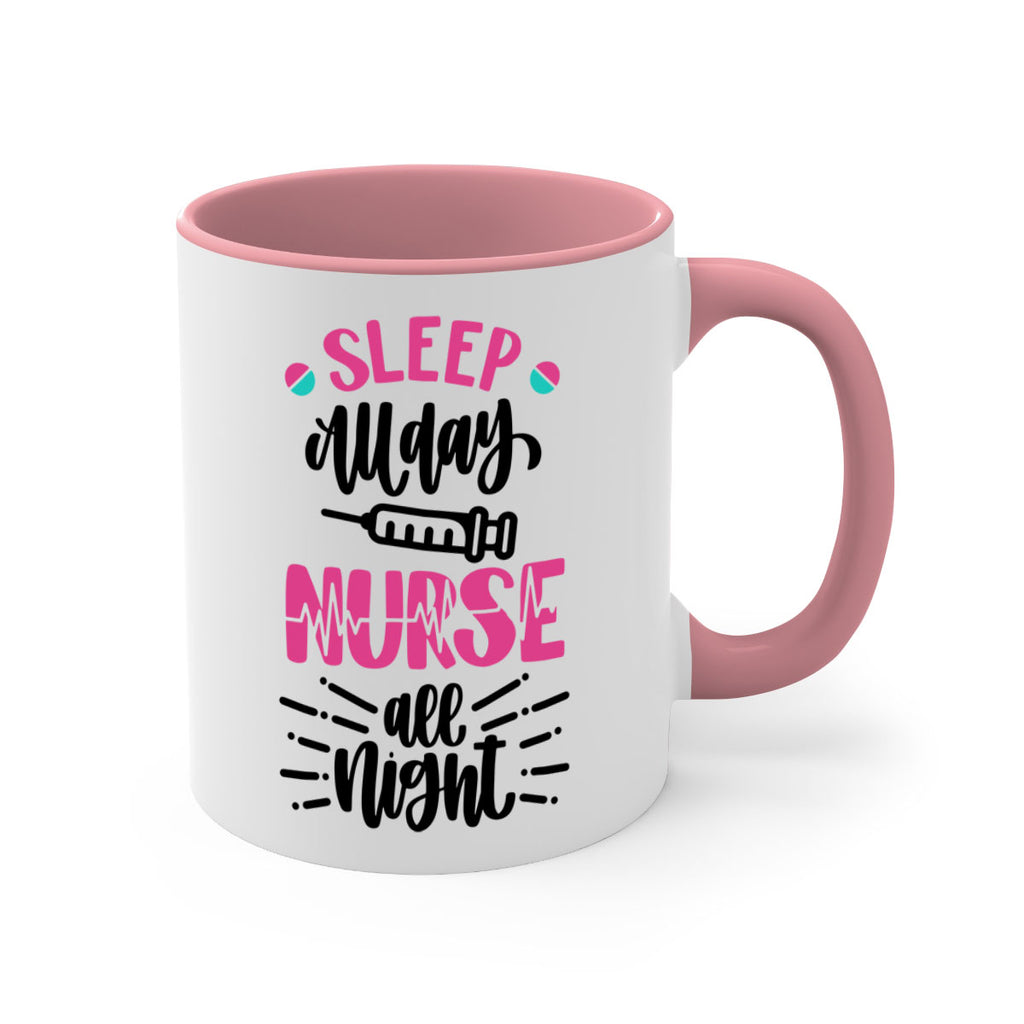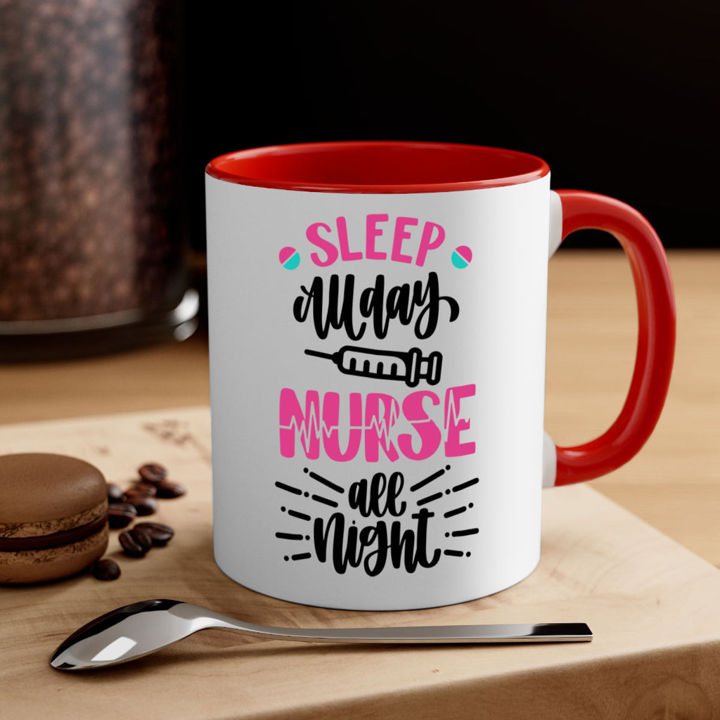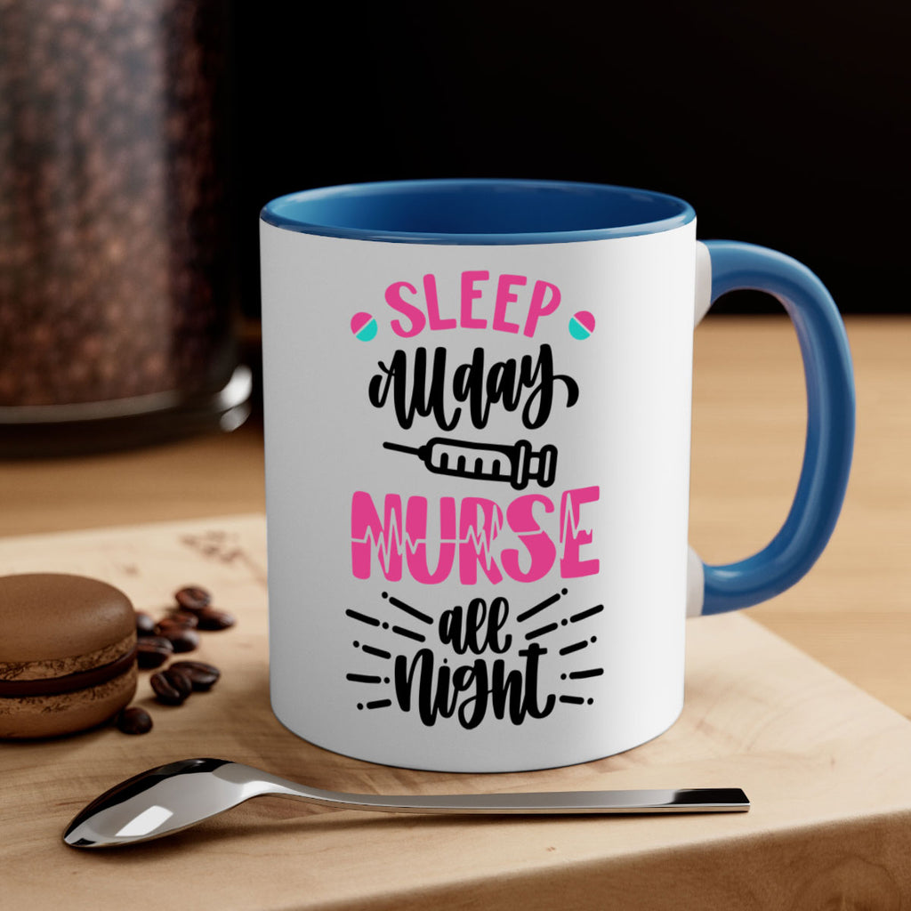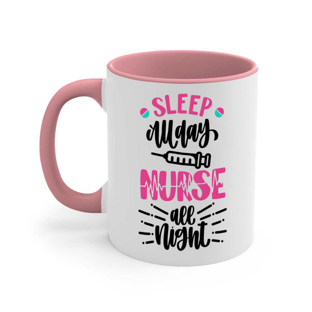 Enjoy the Sleep All Day Nurse All Style Style 33# Mug . Here to bring big gulps of coffee, Tea or any beverage and style, these two-tone coffee mugs help people around the world start the day just right. Choose between 5 different color options and 2 sizes to best complement the design. Each mug comes with a colored handle, a colored interior, and a classy, glossy finish so that your mugs become an instant favorite.