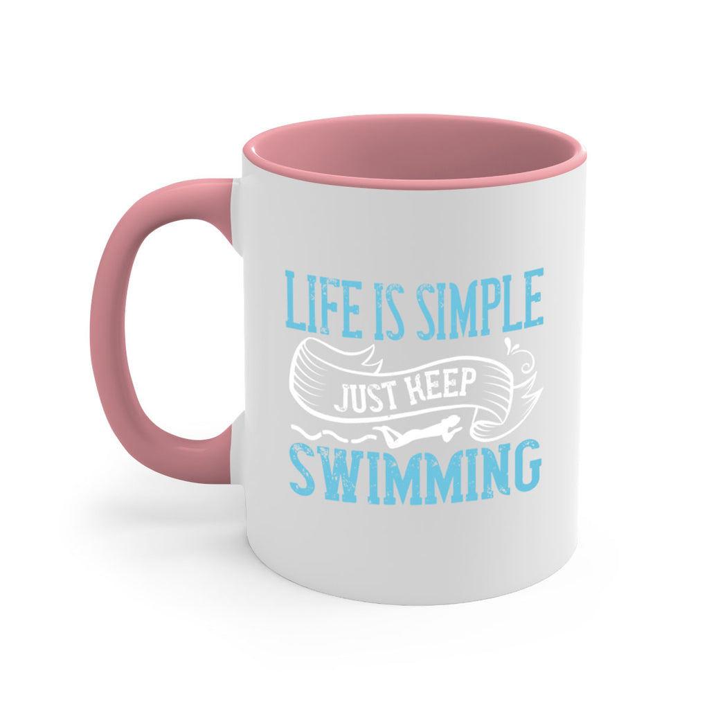 Enjoy the LIFE IS SIMPLE JUST KEEP SWIMMING 895# Mug . Here to bring big gulps of coffee, Tea or any beverage and style, these two-tone coffee mugs help people around the world start the day just right. Choose between 5 different color options and 2 sizes to best complement the design. Each mug comes with a colored handle, a colored interior, and a classy, glossy finish so that your mugs become an instant favorite.