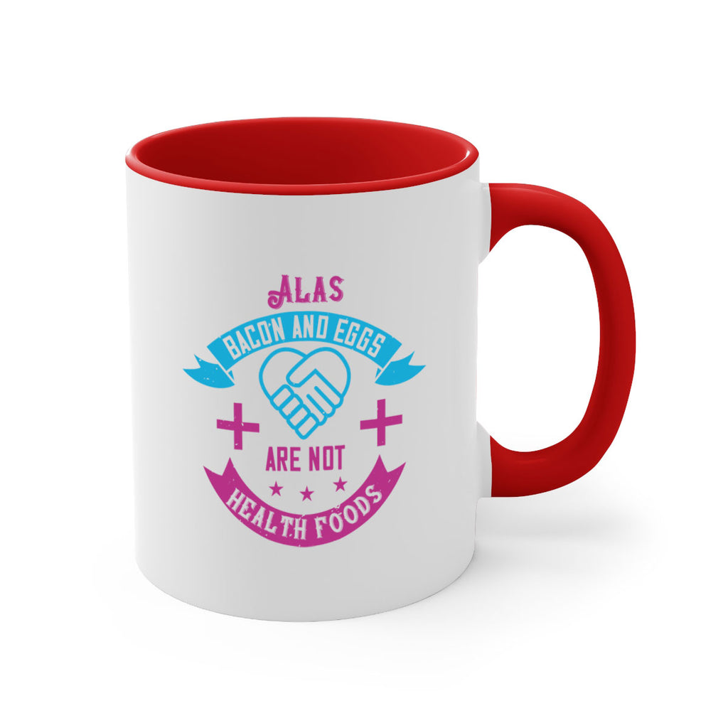Enjoy the Alas bacon and eggs are not health foods Style 39# Mug . Here to bring big gulps of coffee, Tea or any beverage and style, these two-tone coffee mugs help people around the world start the day just right. Choose between 5 different color options and 2 sizes to best complement the design. Each mug comes with a colored handle, a colored interior, and a classy, glossy finish so that your mugs become an instant favorite.