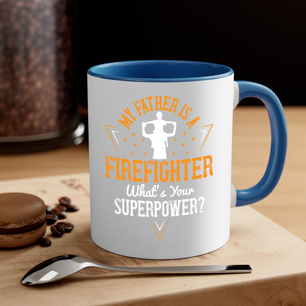 Enjoy the my father is a firefighter whats your superpower 214# Mug . Here to bring big gulps of coffee, Tea or any beverage and style, these two-tone coffee mugs help people around the world start the day just right. Choose between 5 different color options and 2 sizes to best complement the design. Each mug comes with a colored handle, a colored interior, and a classy, glossy finish so that your mugs become an instant favorite.