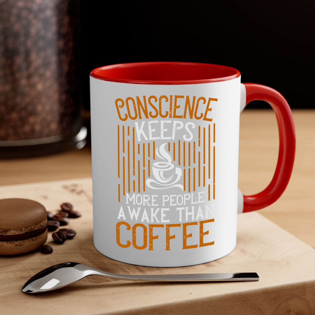 Enjoy the conscience keeps more people awake than coffee 272# Mug . Here to bring big gulps of coffee, Tea or any beverage and style, these two-tone coffee mugs help people around the world start the day just right. Choose between 5 different color options and 2 sizes to best complement the design. Each mug comes with a colored handle, a colored interior, and a classy, glossy finish so that your mugs become an instant favorite.