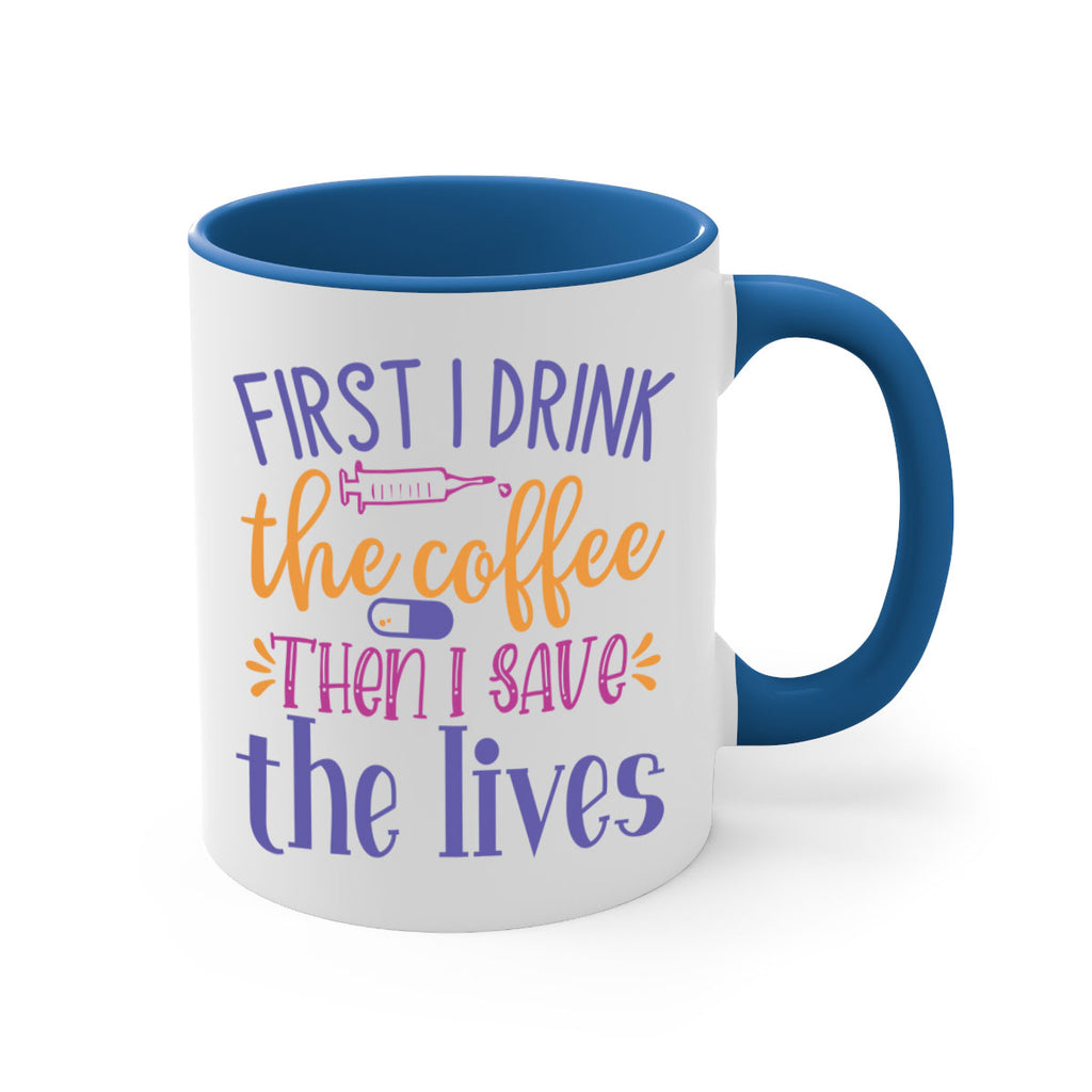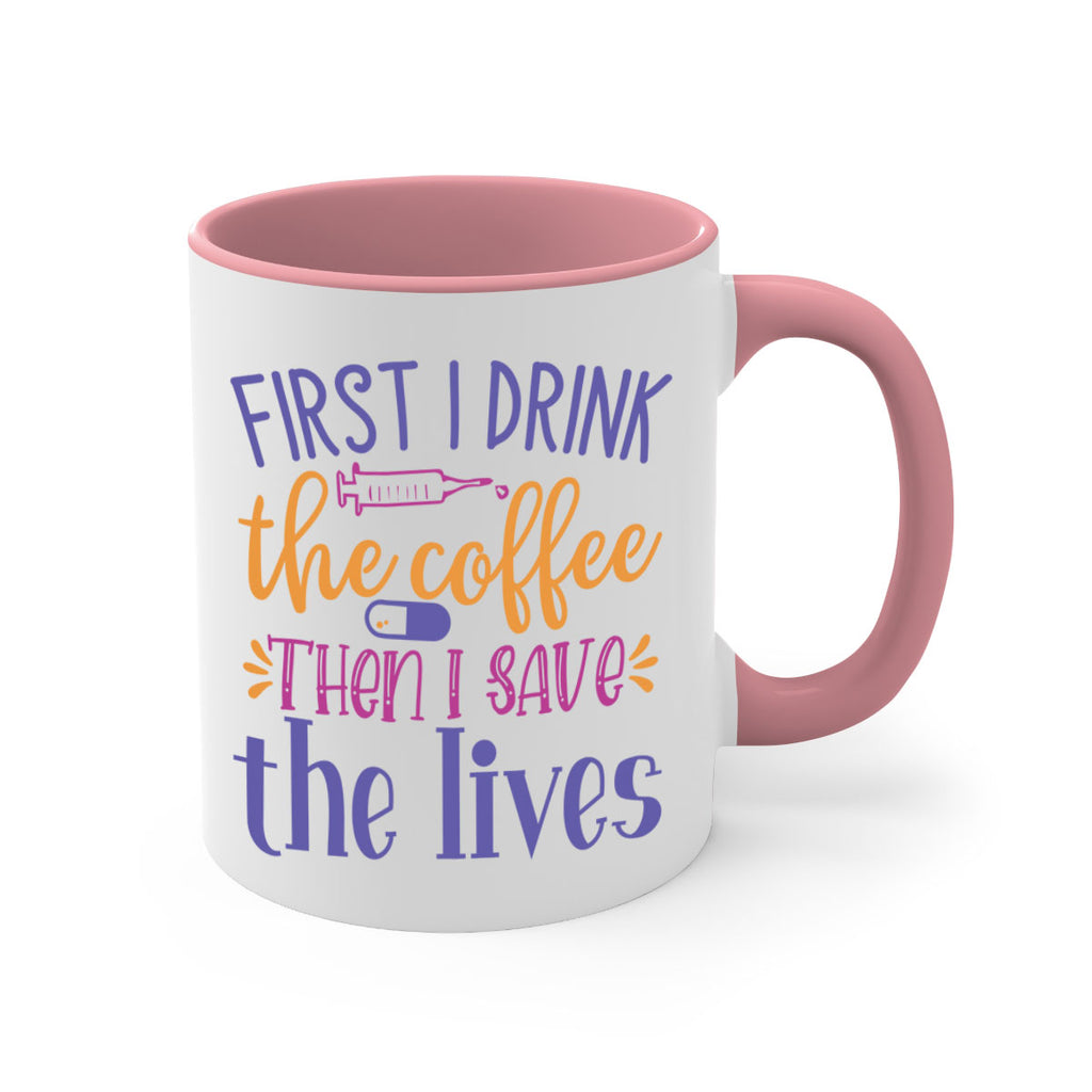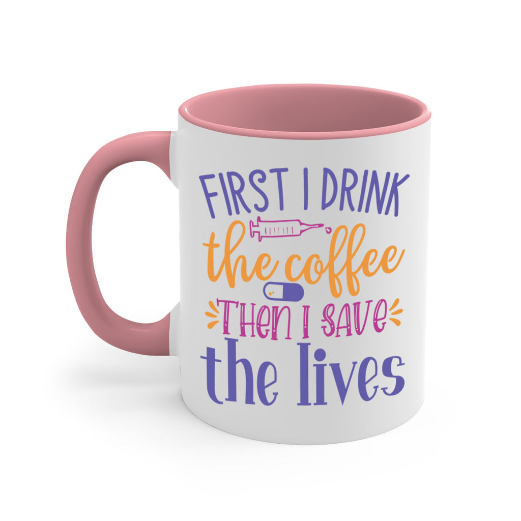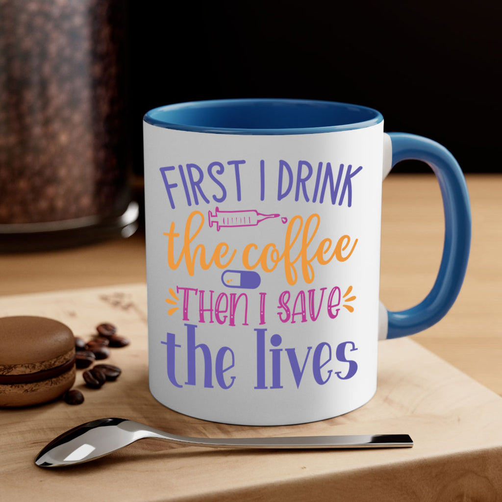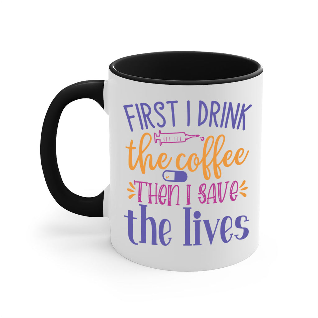 Enjoy the first i drink the coffee then i save the lives Style 384# Mug . Here to bring big gulps of coffee, Tea or any beverage and style, these two-tone coffee mugs help people around the world start the day just right. Choose between 5 different color options and 2 sizes to best complement the design. Each mug comes with a colored handle, a colored interior, and a classy, glossy finish so that your mugs become an instant favorite.