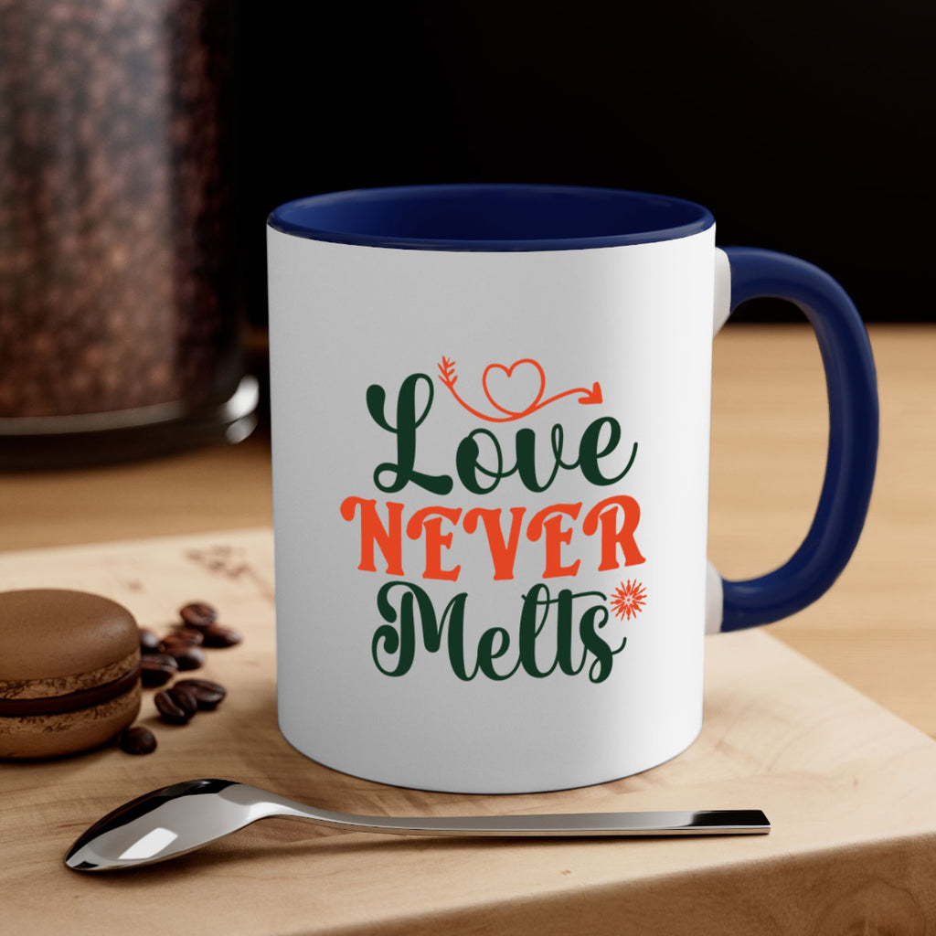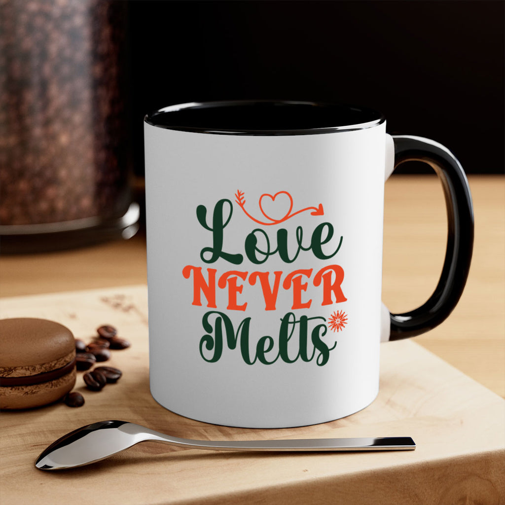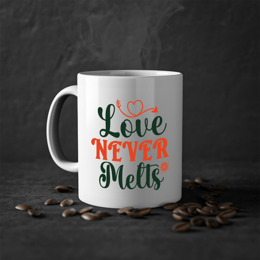 Enjoy the Love Never Melts 312# Mug . Here to bring big gulps of coffee, Tea or any beverage and style, these two-tone coffee mugs help people around the world start the day just right. Choose between 5 different color options and 2 sizes to best complement the design. Each mug comes with a colored handle, a colored interior, and a classy, glossy finish so that your mugs become an instant favorite.