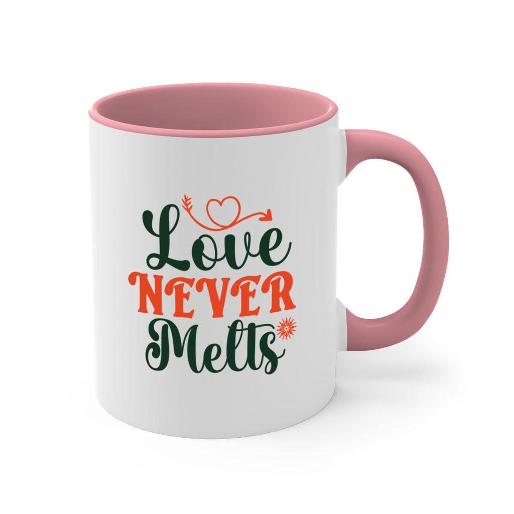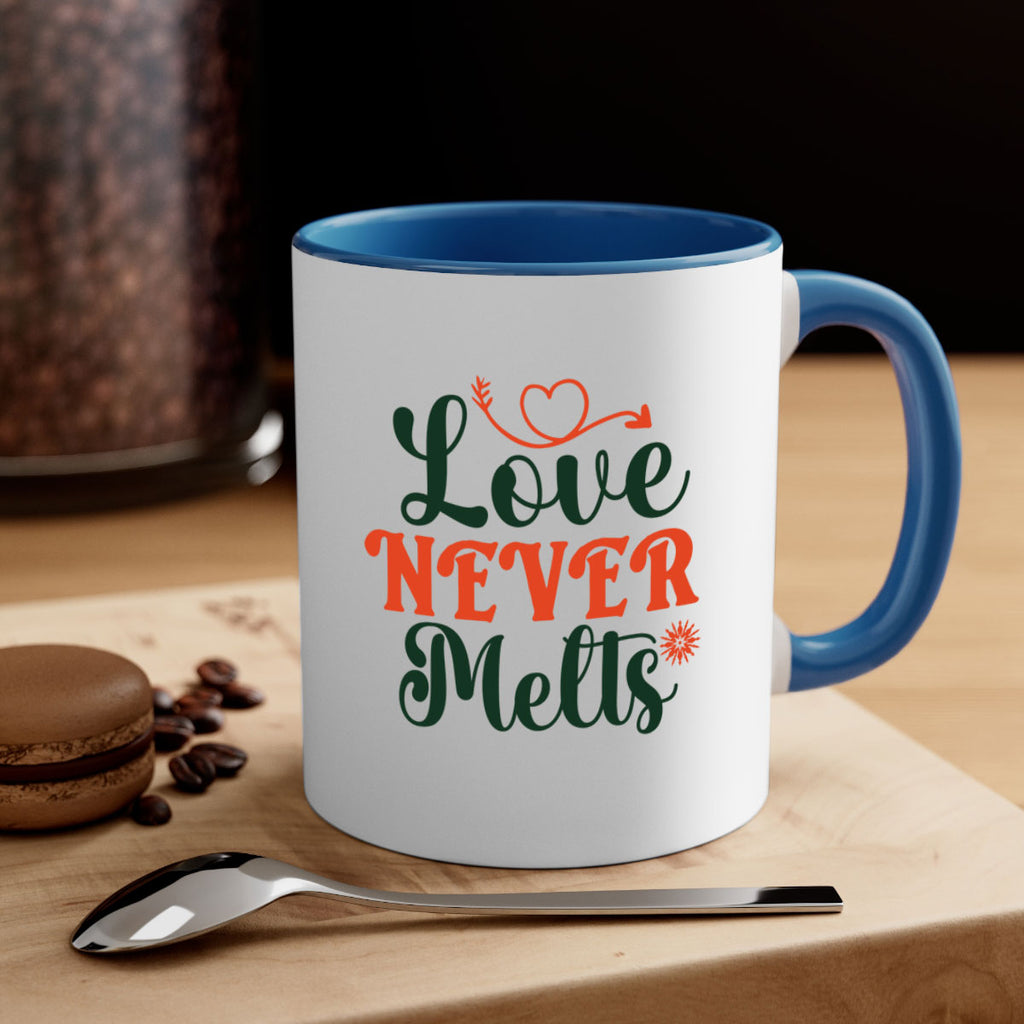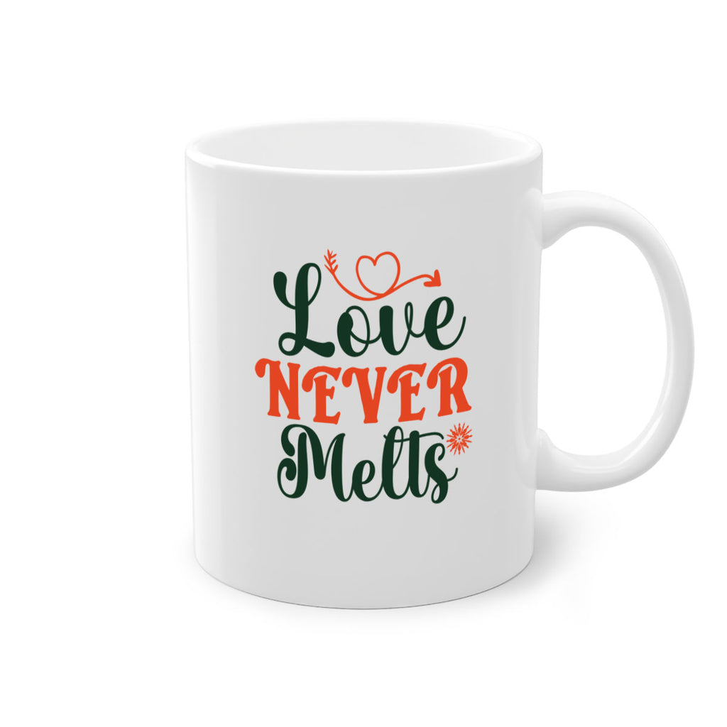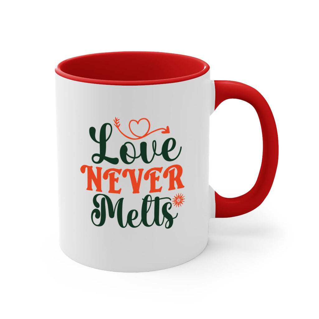 Enjoy the Love Never Melts 312# Mug . Here to bring big gulps of coffee, Tea or any beverage and style, these two-tone coffee mugs help people around the world start the day just right. Choose between 5 different color options and 2 sizes to best complement the design. Each mug comes with a colored handle, a colored interior, and a classy, glossy finish so that your mugs become an instant favorite.