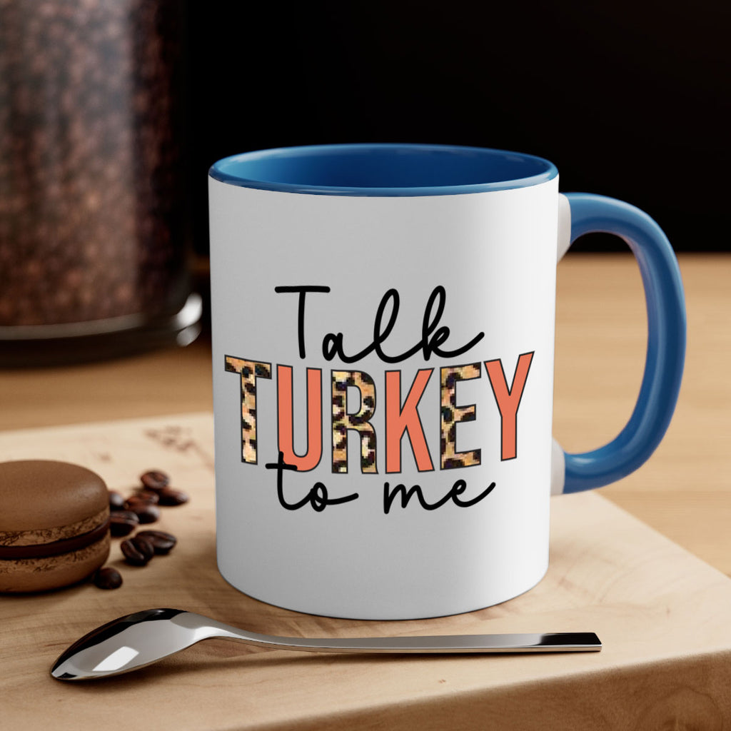 Enjoy the Talk turkey to me 595# Mug . Here to bring big gulps of coffee, Tea or any beverage and style, these two-tone coffee mugs help people around the world start the day just right. Choose between 5 different color options and 2 sizes to best complement the design. Each mug comes with a colored handle, a colored interior, and a classy, glossy finish so that your mugs become an instant favorite.